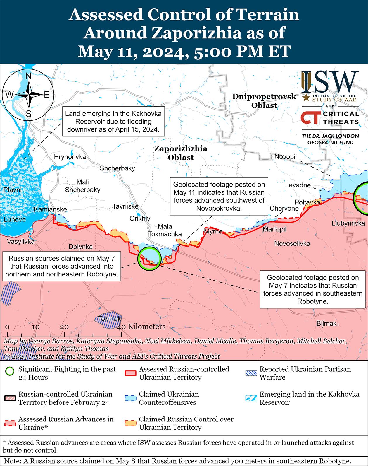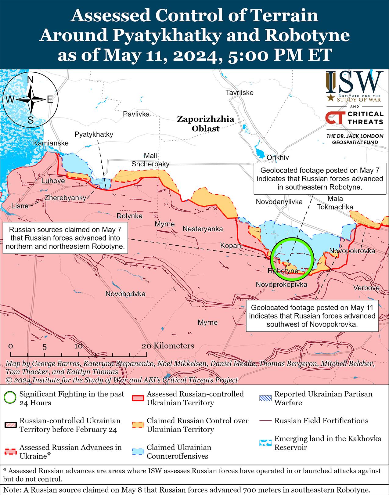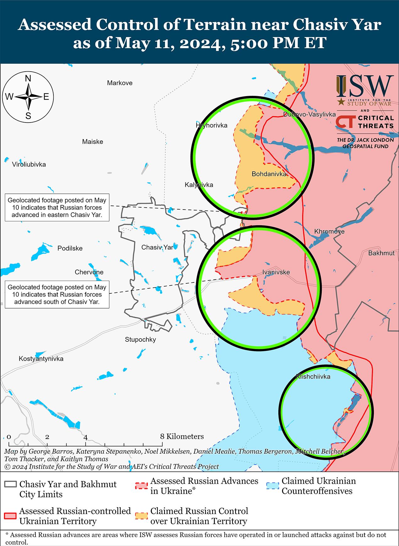 Ограниченные российские наступательные операции на севере Харьковской области позволяют предположить, что возобновление помощи США в сфере безопасности не изменило расчеты Путина или что он начал операцию в Харькове без переоценки фундаментальных предположений операции о возможностях Украины в свете возобновления помощи. Российские войска в настоящее время атакуют группировкой сил, которая значительно ниже заявленной предполагаемой конечной численности. Это рискованное решение, если Путин и российское военное командование считают, что существует угроза для украинских сил свести на нет любые тактические успехи, которые эти недостаточно укомплектованные силы могли бы сделать, если бы они были укомплектованы полностью. Российские войска в настоящее время продвигаются на нескольких направлениях, которые не обеспечивают непосредственных путей продвижения к Харькову или другим непосредственным оперативно значимым объектам. Российские войска, возможно, продвигаются в этих районах, поскольку они считают, что могут удерживать любую захваченную территорию в течение неопределенного времени и использовать эту территорию для начала последующих операций для достижения более значимых с оперативной точки зрения целей. Российские войска могут также полагать, что они могут осуществлять постепенное ползучее наступление на обширной территории на севере и северо-востоке Харьковской области в течение длительного периода времени, не добившись относительно быстрого оперативного продвижения, но таким образом, что это поставит в невыгодное положение любые будущие украинские контрнаступательные операции в этом районе.