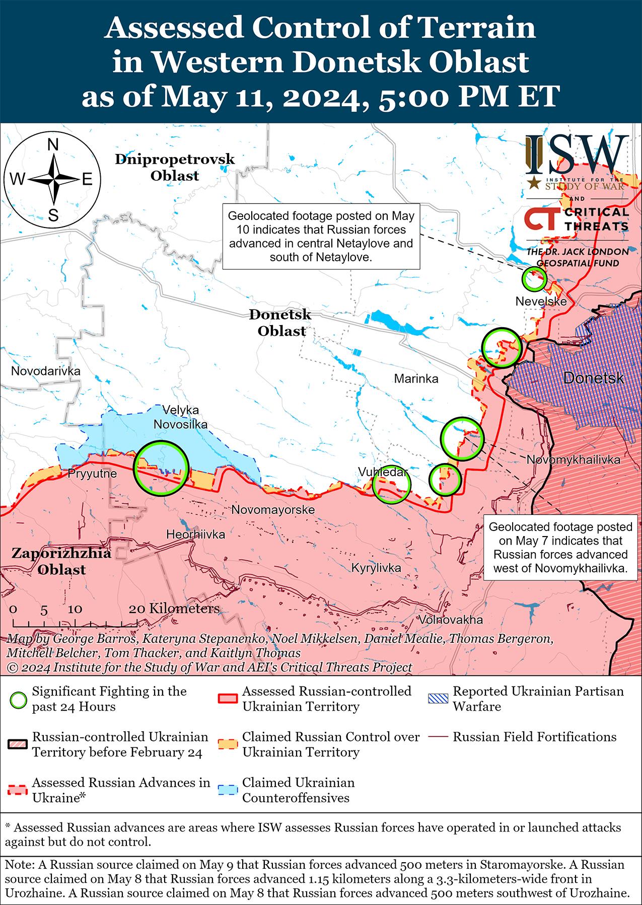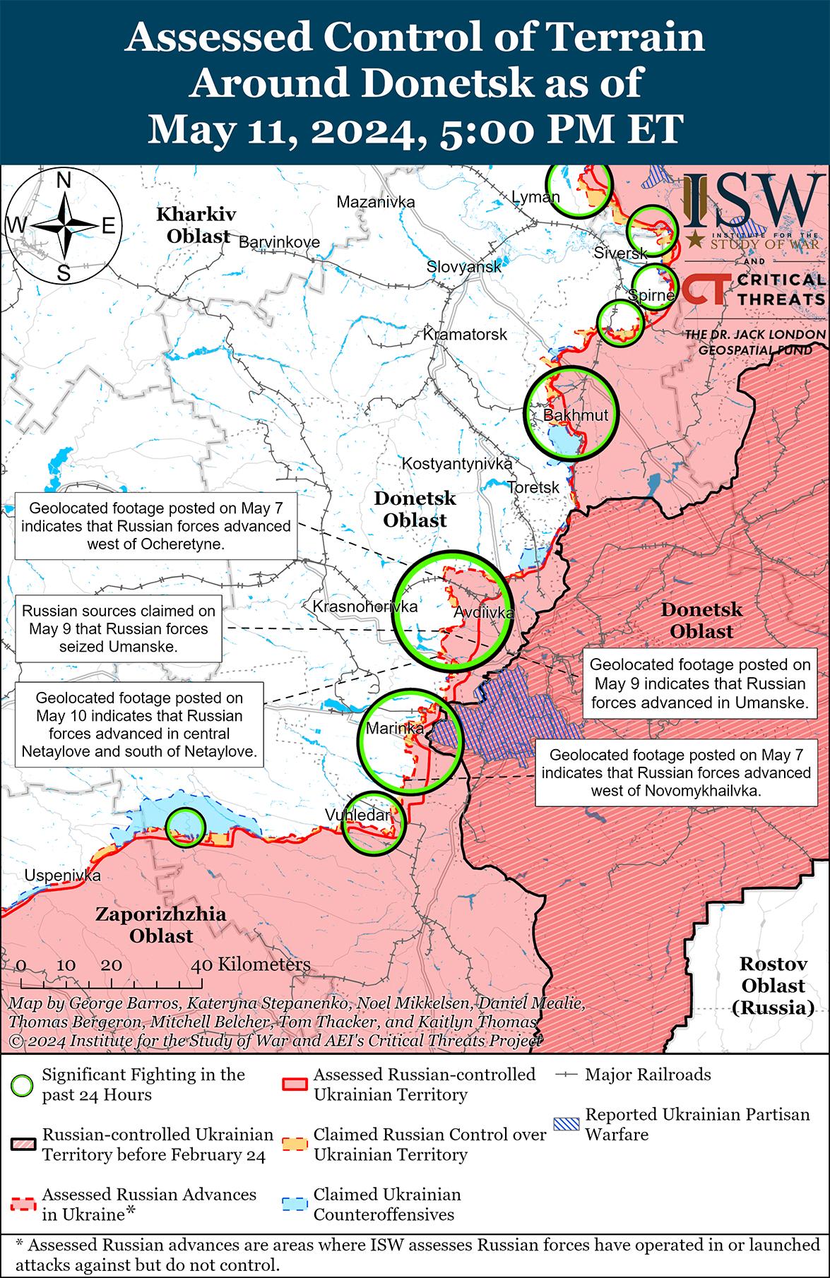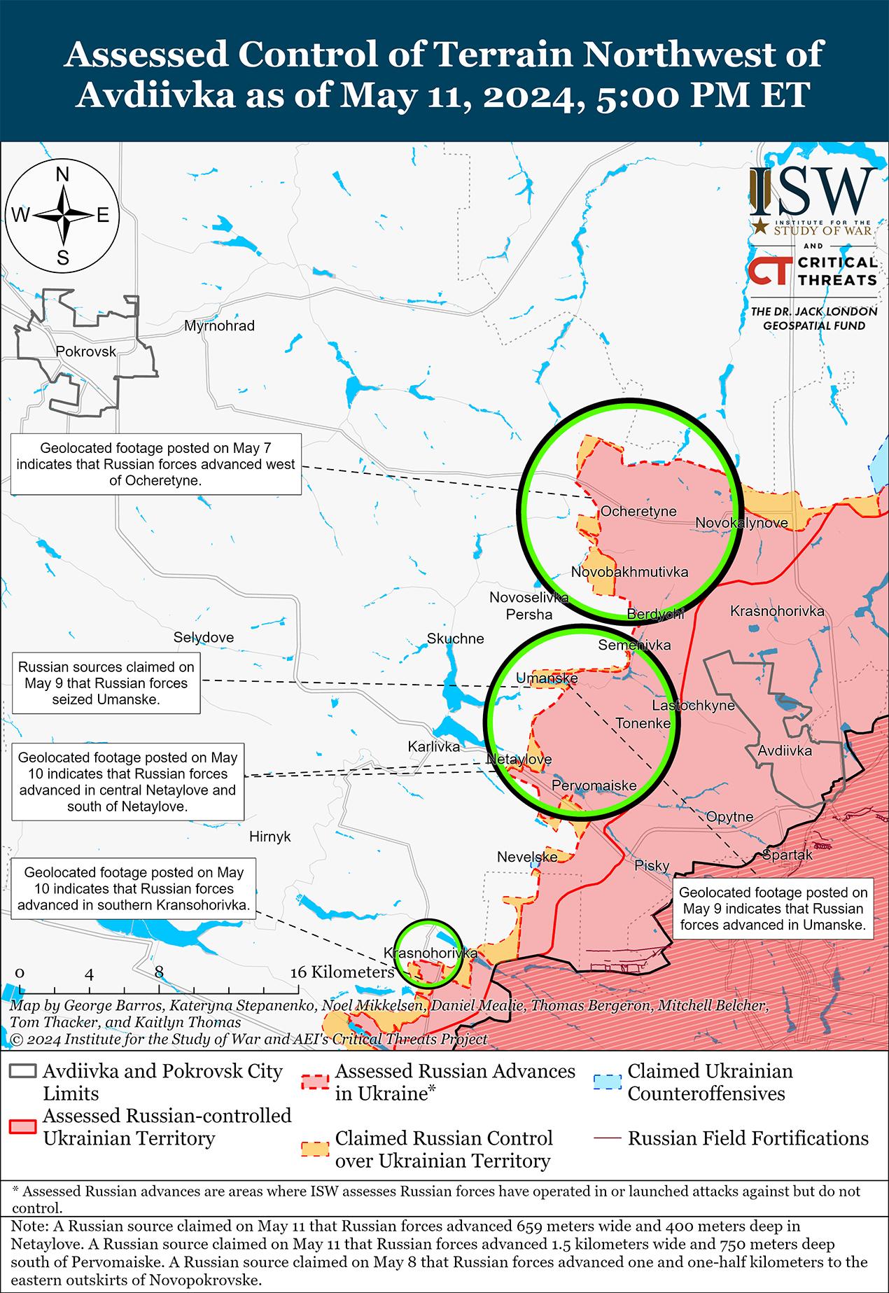 Российские войска недавно подтвердили продвижение к западу от Авдеевки на фоне продолжающихся российских наступательных операций в этом районе 11 мая. Геолоцированные кадры, опубликованные 10 мая, свидетельствуют о том, что российские войска недавно продвинулись в центральной части Нетайлова (юго-западнее Авдеевки) и к югу от населенного пункта. [54] Российские военные блогеры утверждали, что российские войска продвинулись к западу от Нетайлова и к югу от Первомайского на участке фронтом до 1,5 км и глубиной до 750 м, хотя визуальных подтверждений этих заявлений ISW не наблюдалось. [55] Бои продолжались также северо-западнее Авдеевки в районах населенных пунктов Калиново, Новоалександровка, Евгеновка, Новопокровское, Очеретино, Семеновка, Новоселовка Перша и Сокол; и к западу от Авдеевки возле Уманского и Нетайлова. [56]