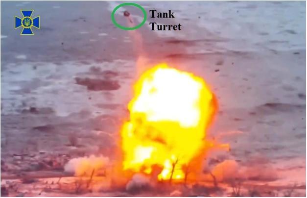 Хранящиеся боеприпасы в российском танке, в который попал беспилотник FPV, взрываются, что приводит к подбрасыванию башни. МИНИСТЕРСТВО ОБОРОНЫ УКРАИНЫ