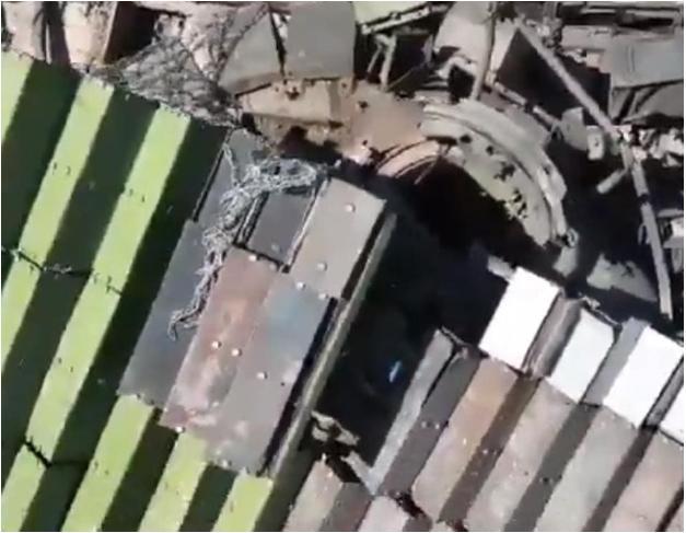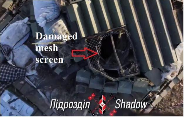 Дверной подход с ширмой не дает полной защиты, только временную передышку. Еще одно видео, на этот раз от 10 апреляЙ, на котором изображен российский танк с проволочной сеткой над люком командира. При ближайшем рассмотрении в сетке есть большое круглое отверстие, вероятно, от предыдущей гранаты. Это позволяет дрону теневого отряда сбросить обычный M67 через отверстие и добить еще один российский танк.