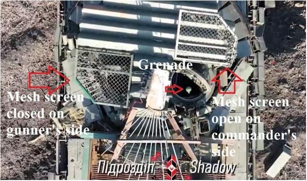 Простым решением является легкий сетчатый экран над люком, что-то вроде дверцы-сетки для защиты от насекомых и с той же функцией пропускания свежего воздуха, не допуская неудобств и легко открываясь и закрываясь. Этот подход показан на другом видео подрыва Т-90М ShadowUnit, на этот раз от 6 маяЙ. Два навесных экрана, сделанных, по-видимому, из секций от сетчатого забора, защищают люки наводчика и командира. Однако, помимо того, что командир оставил люк открытым, он также оставил крышку люка открытой, и снова одна граната М67 отправляет российскую технику на 4 миллиона долларов в огненный конец.
