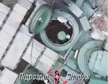 Существует аналогичный пример от 10 маяЙ, видео, в котором мы видим только финальный акт, но экран крыши над люком командира систематически разрушается, а маленькая бомба с беспилотника украинского производства производит впечатляющий огненный шар.