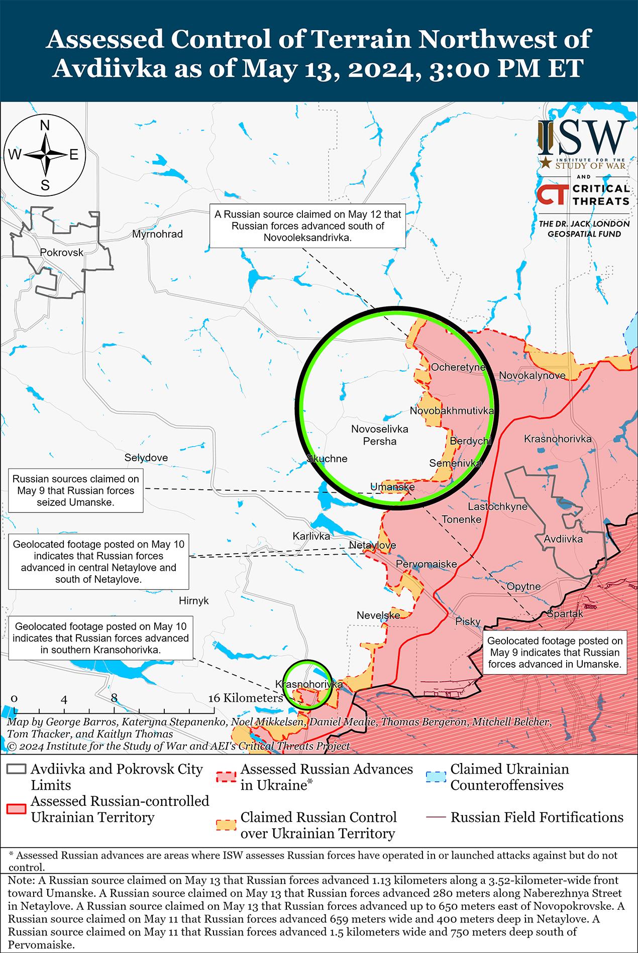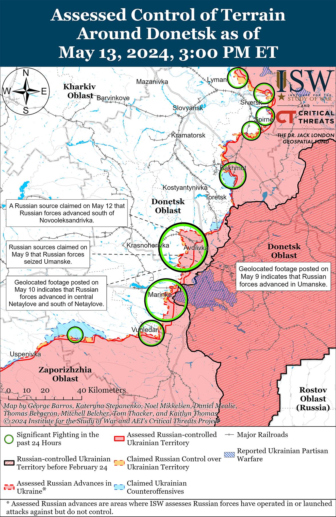 Сообщается, что 13 мая российские войска продолжали наступление к западу от Авдеевки. Российские военные блогеры утверждали, что российские войска продвинулись к западу от Очеретино (северо-запад Авдеевки) в направлении Новоалександровки. [59] Некоторые блогеры также утверждали, что российские войска продвинулись к западу от Семеновки (северо-запад Авдеевки) и продвинулись вглубь до 1,13 км и по фронту 3,52 км в направлении Уманского (западнее Авдеевки). [60] Однако ISW пока не обнаружил визуального подтверждения этих заявлений. Российские военные блогеры утверждали, что российские войска в основном атакуют к северу от Авдеевки на Архангельском направлении; северо-западнее Авдеевки на линии Соловьево-Новопокровское; к западу от Авдеевки в направлении Уманского; и юго-западнее Авдеевки на линии Нетайлово-Первомайское-Невельское. [61]