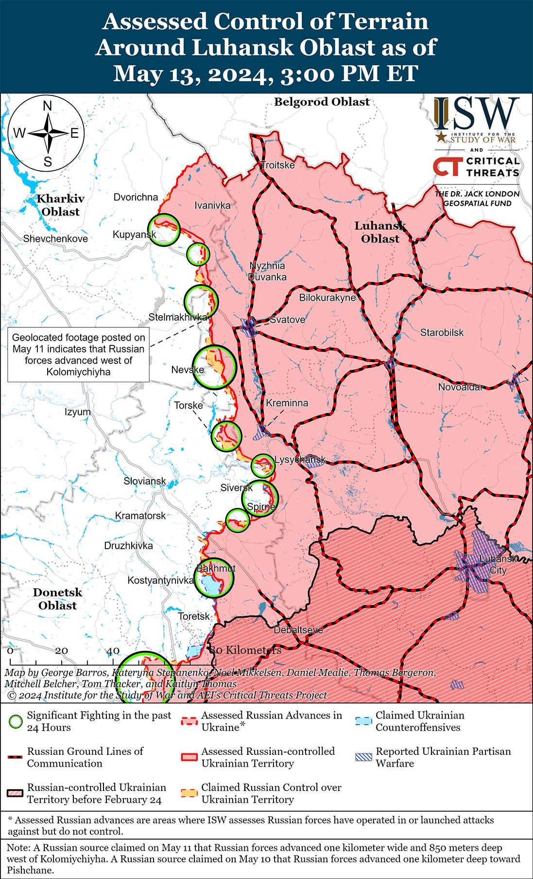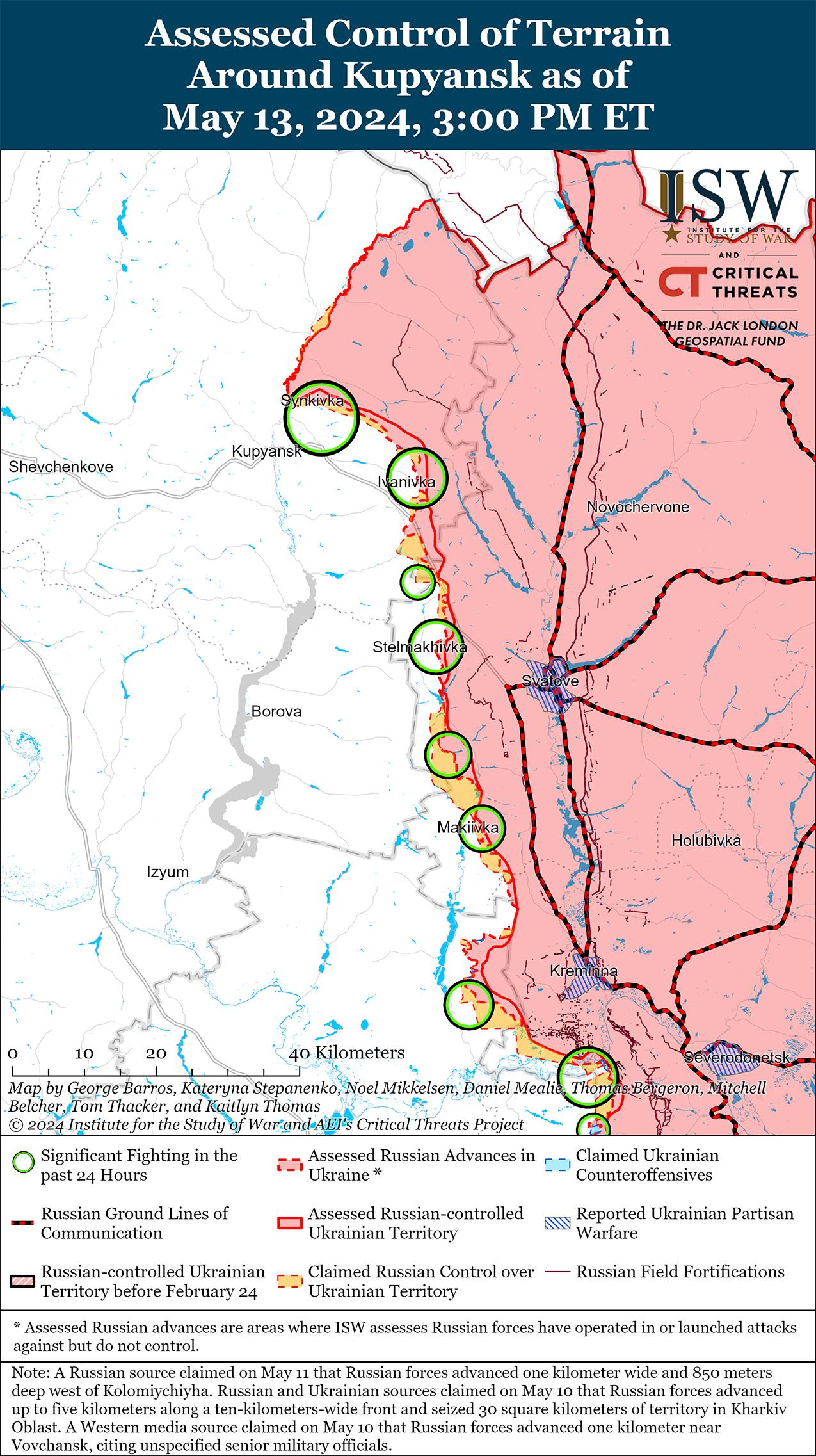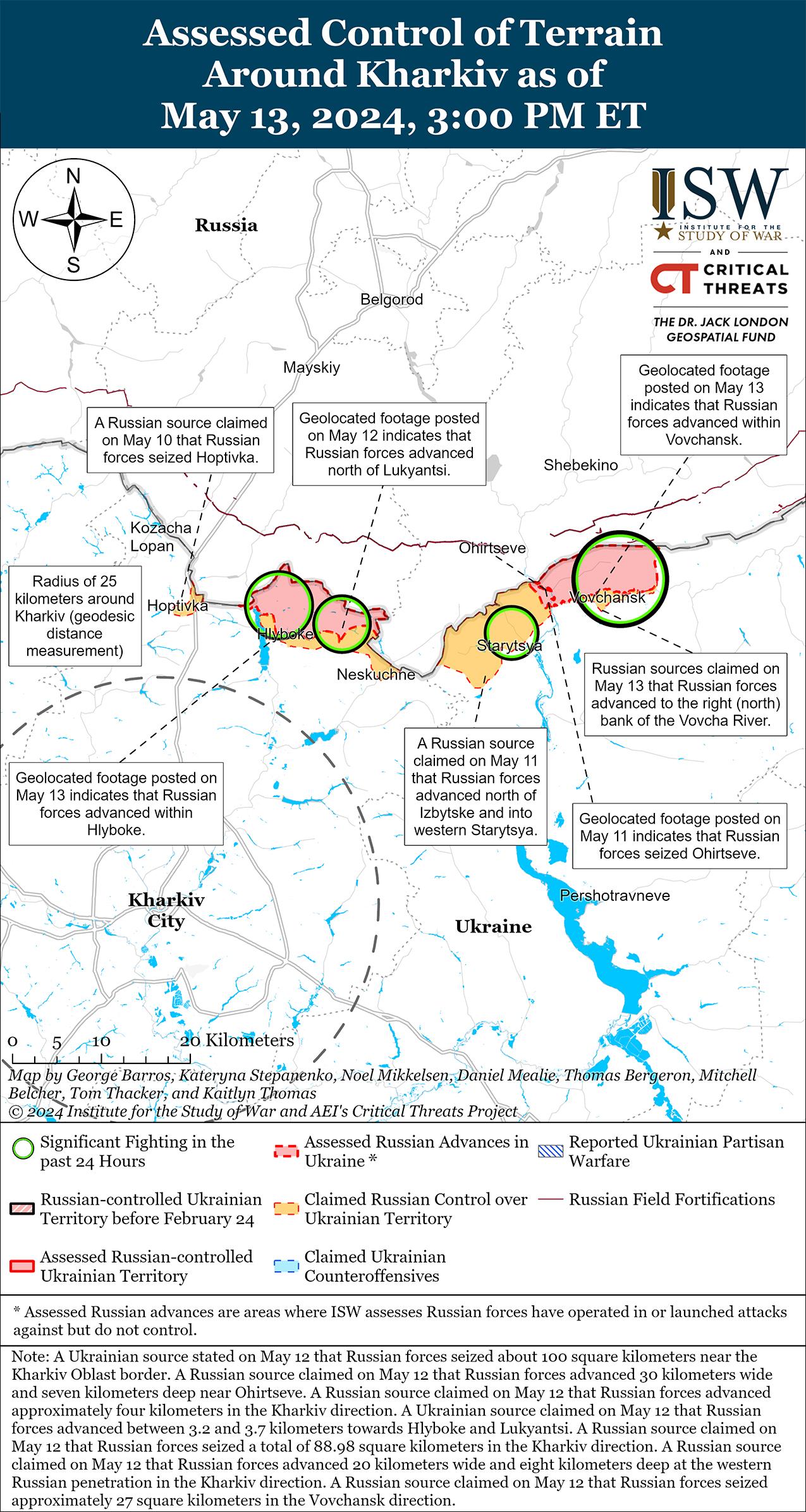 - По состоянию на 13 мая российские войска продолжали совершать тактически значимые успехи к северу и северо-востоку от Харькова и в настоящее время, судя по всему, отдают приоритет быстрому созданию «буферной зоны» вдоль международной границы, а не созданию условий для более глубокого проникновения на север Харьковской области.