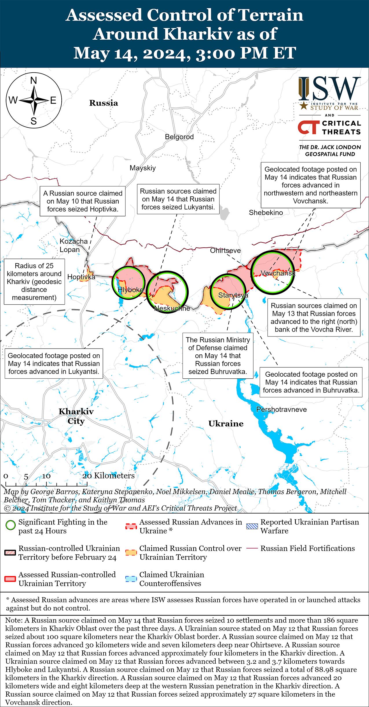 Темпы российских наступательных операций на севере Харьковской области, по-видимому, замедлились за последние 24 часа, и характер российской наступательной активности в этом районе согласуется с оценкой ISW о том, что российские силы отдают приоритет созданию «буферной зоны» в районе международной границы, а не более глубокому проникновению в Харьковскую область. Несколько украинских военных чиновников сообщили 14 мая, что, по их мнению, ситуация в Харьковской области постепенно стабилизируется — начальник Главного управления военной разведки (ГУР) Украины генерал-лейтенант Кирилл Буданов заявил 14 мая, что ситуация в Харьковской области начала стабилизироваться в ночь с 13 на 14 мая, когда в этот район были переброшены дополнительные украинские подразделения, которые начали обороняться от российских наступлений. [1] Пресс-секретарь Генерального штаба ВСУ и украинской Хортицкой группировки войск подполковник Назар Волошин отметил, что украинские силы начали «зачищать» Волчанск, нанося удары по видимым российским штурмовым группам в населенном пункте. [2] Несколько российских и украинских источников также сообщили, что российские войска используют новую тактику на этом направлении — используют небольшие штурмовые группы численностью не более пяти человек для прорыва украинских позиций, а затем сливаются с другими небольшими штурмовыми группами для объединения в более крупную ударную группу. [3] На кадрах, снятых с беспилотника, предположительно из Волчанска, видно, как российская пешая мобильная пехота действует в населенном пункте небольшими штурмовыми группами размером с отделение, что согласуется с украинскими сообщениями. [4]