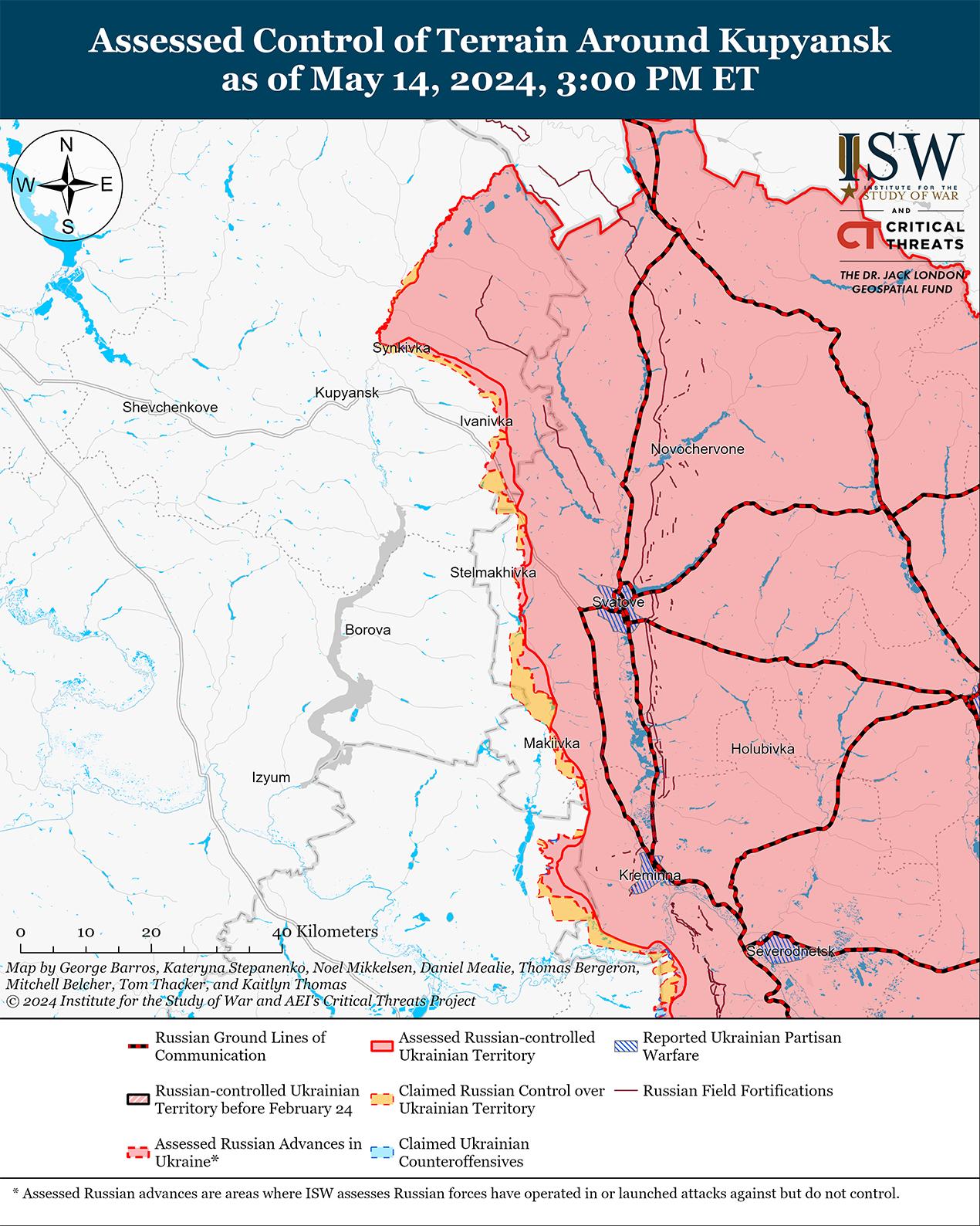 Однако использование небольших штурмовых групп может способствовать увеличению потерь в живой силе и технике противника и замедлению общего темпа наступления на этом направлении. Один российский военный комментатор, ранее служивший инструктором в подразделении «Шторм-Z», пожаловался, что кадры с небольшими российскими штурмовыми группами свидетельствуют о плохой подготовке и обучении, а не об эффективной новой тактике. [5] Украинский военный обозреватель Константин Машовец отметил, что растущие потери россиян на этом направлении приводят к снижению общих темпов наступательных действий. [6] Начальник Генерального штаба Украины генерал-майор Анатолий Баргилевич предположил, что только за прошедшие сутки российские войска потеряли на этом направлении до 1740 военных, что является очень высоким показателем потерь. [7] ISW не может независимо подтвердить эту цифру, но предполагаемый уровень потерь может согласовываться с общим более медленным темпом наступательных операций, наблюдавшимся 14 мая. Если темпы российских операций останутся относительно низкими, российские силы, скорее всего, сосредоточатся на укреплении новых позиций и создании бокового выступа в Харьковской области путем объединения усилий Липцов и Волчанска и создания «буферной зоны» в приграничной зоне, а не продвижения дальше вглубь области, как ранее оценивал ISW. [8]