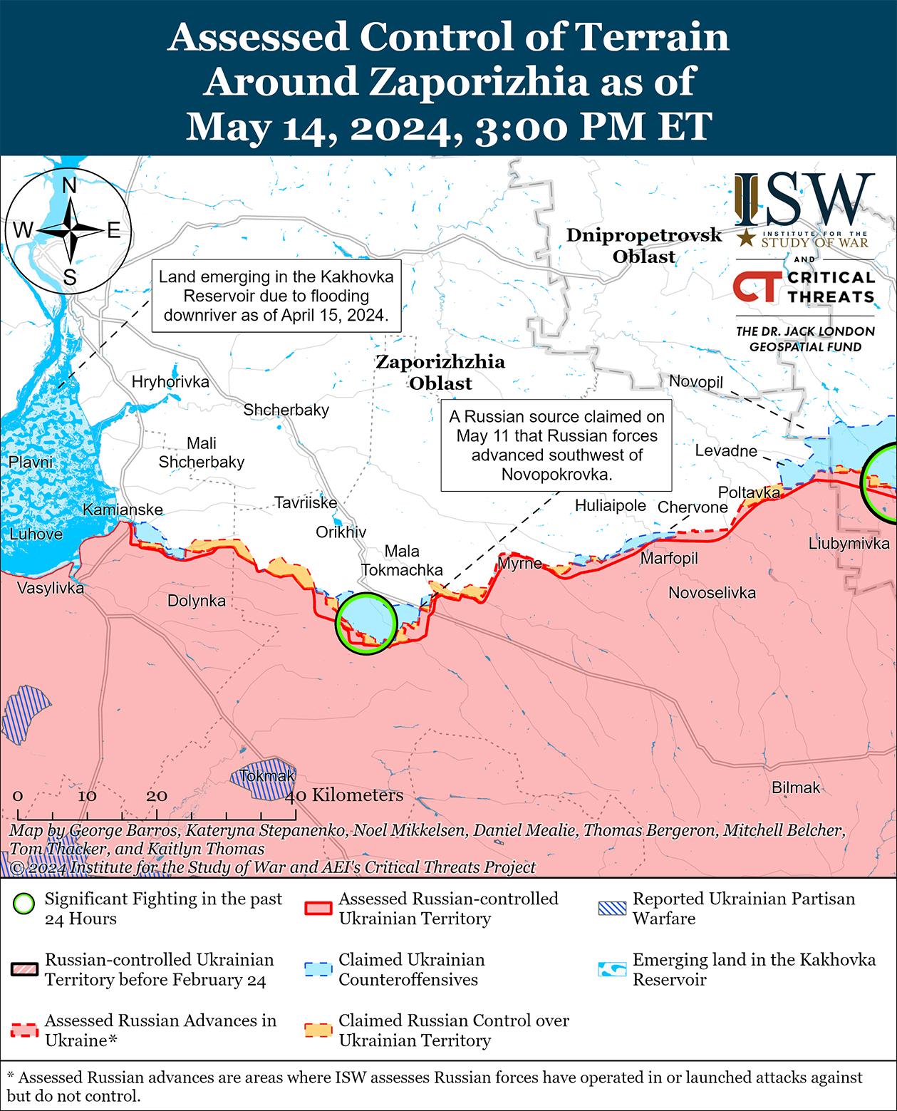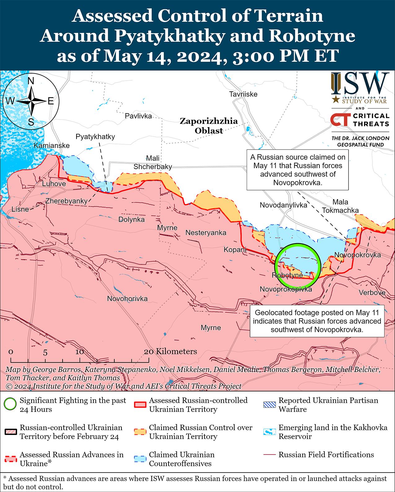 14 мая российские войска продолжили наземные атаки на западе Запорожской области, однако подтвержденных изменений на линии фронта не было. Российский военный блогер заявил, что российские войска продвинулись к северо-западу от Вербовое (к востоку от Работино), хотя ISW не обнаружил визуального подтверждения этого заявления. [70] Враг продолжал штурм вблизи Работино со стороны Новопрокоповки (к югу от Работино). [71] Российский военный блогер утверждал, что в последнее время украинские силы активизировали действия беспилотников на Запорожском направлении. [72] Сообщается, что на Запорожском направлении действуют подразделения российского 392-го мотострелкового полка (вероятно, переформированного в советское время). [73]