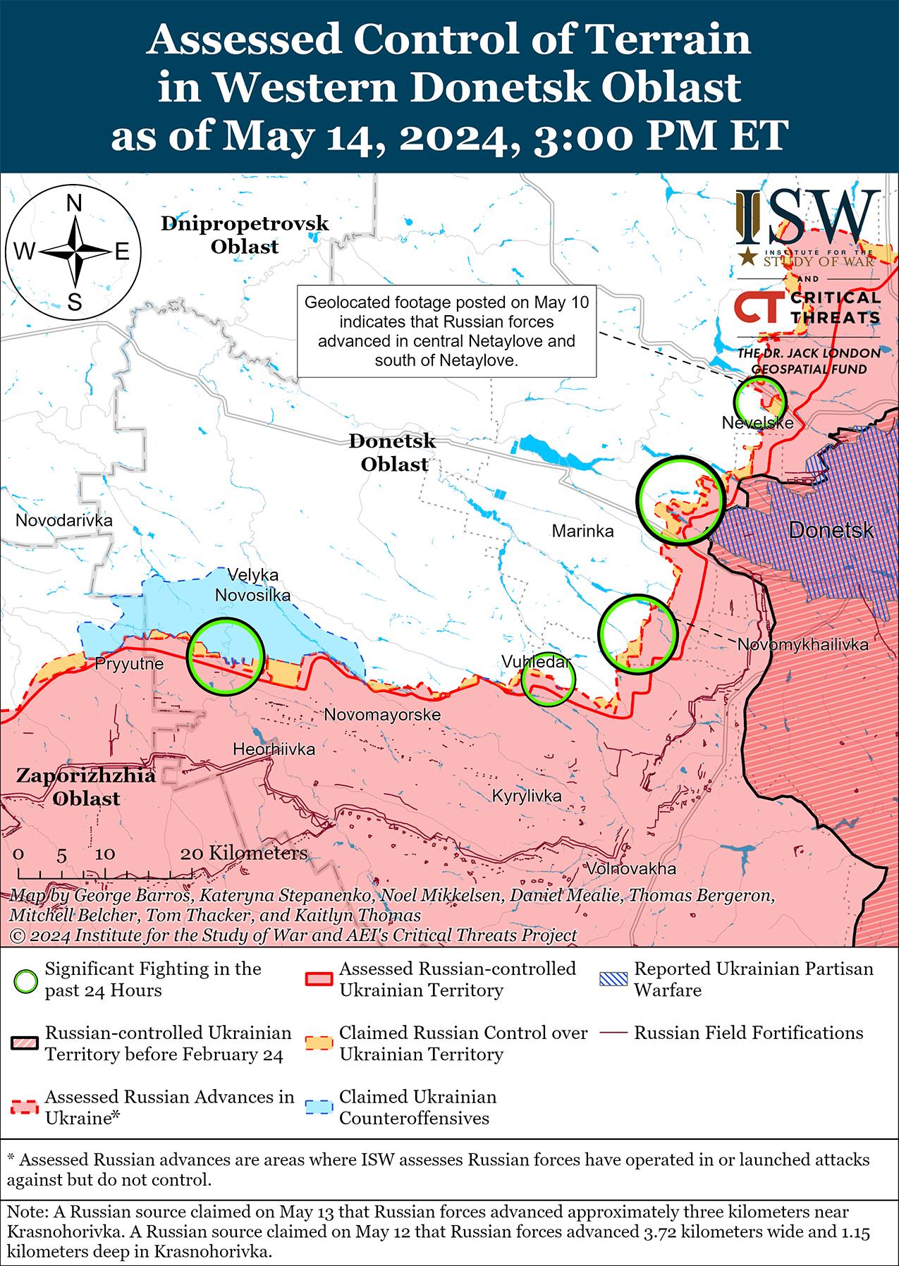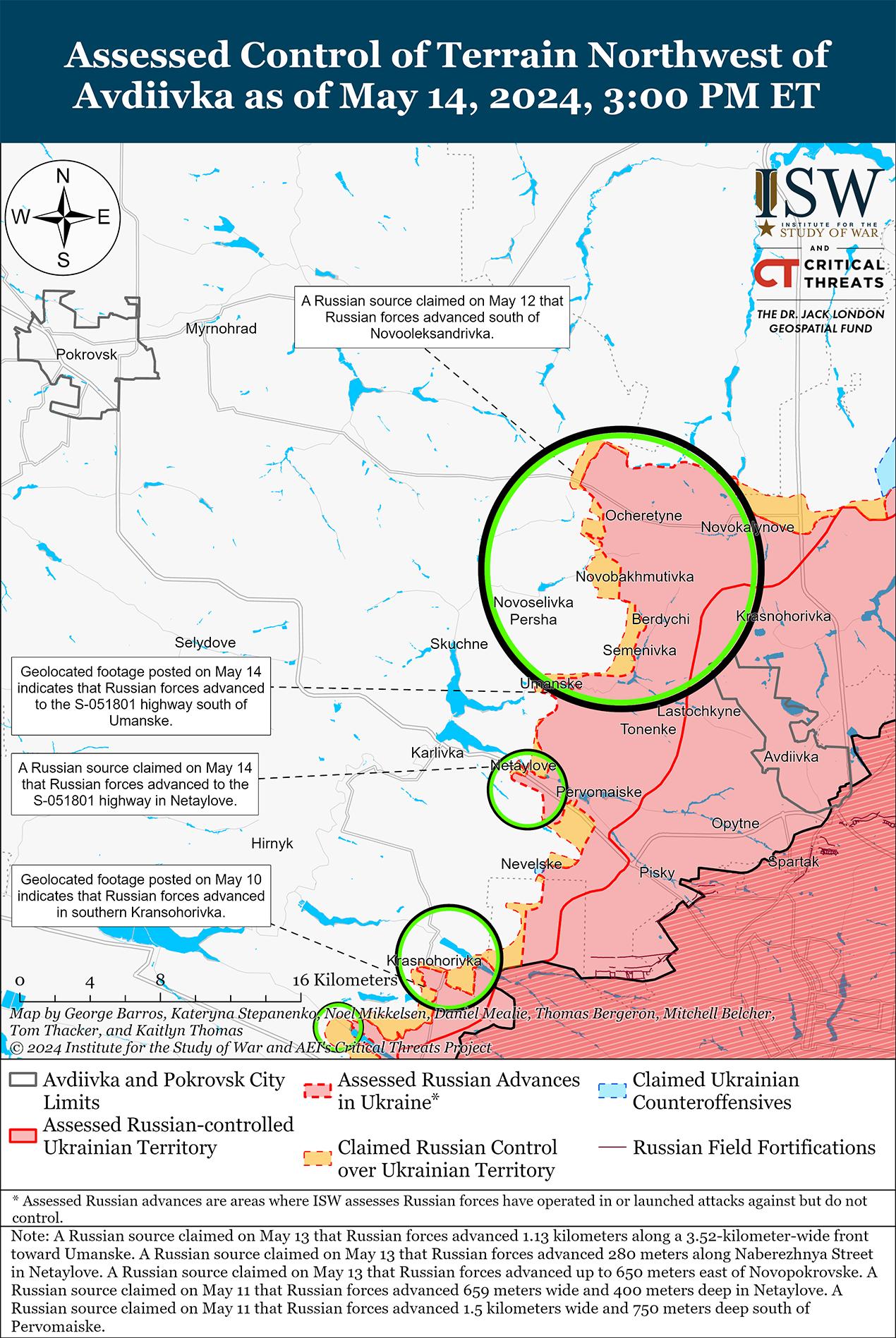 Недавно российские войска незначительно продвинулись к западу от Авдеевки и продолжили наземные атаки в этом районе 14 мая. На геолоцированных кадрах, опубликованных 14 мая, видно, что российские войска продвинулись к югу от Уманского (к западу от Авдеевки) и вышли к трассе С-051801 Новоселовка Перша-Уманское-Яснобродовка. [61] Российские военные блогеры также утверждали, что российские войска продвинулись южнее Первомайского (юго-запад Авдеевки) и далее в районе Нетайлова (юго-западнее Авдеевки), однако ISW не обнаружил визуальных подтверждений этих заявлений. [62] Украинский Генштаб сообщал, что украинские войска «меняли» позиции на некоторых неустановленных участках и что российские войска добились неопределенных тактических успехов на Покровском (Авдеевском) направлении. [63] Враг также продолжал наземные атаки к северо-западу от Авдеевки в районах населенных пунктов Очеретино, Новоалександровка, Евгеновка, Калиново, Архангельское, Соловьево и Сокол; и западнее Авдеевки в районе Уманского, Семеновки и Яснобродовки. [64]