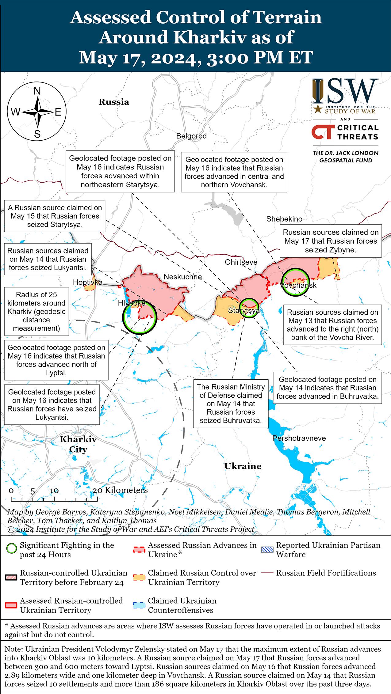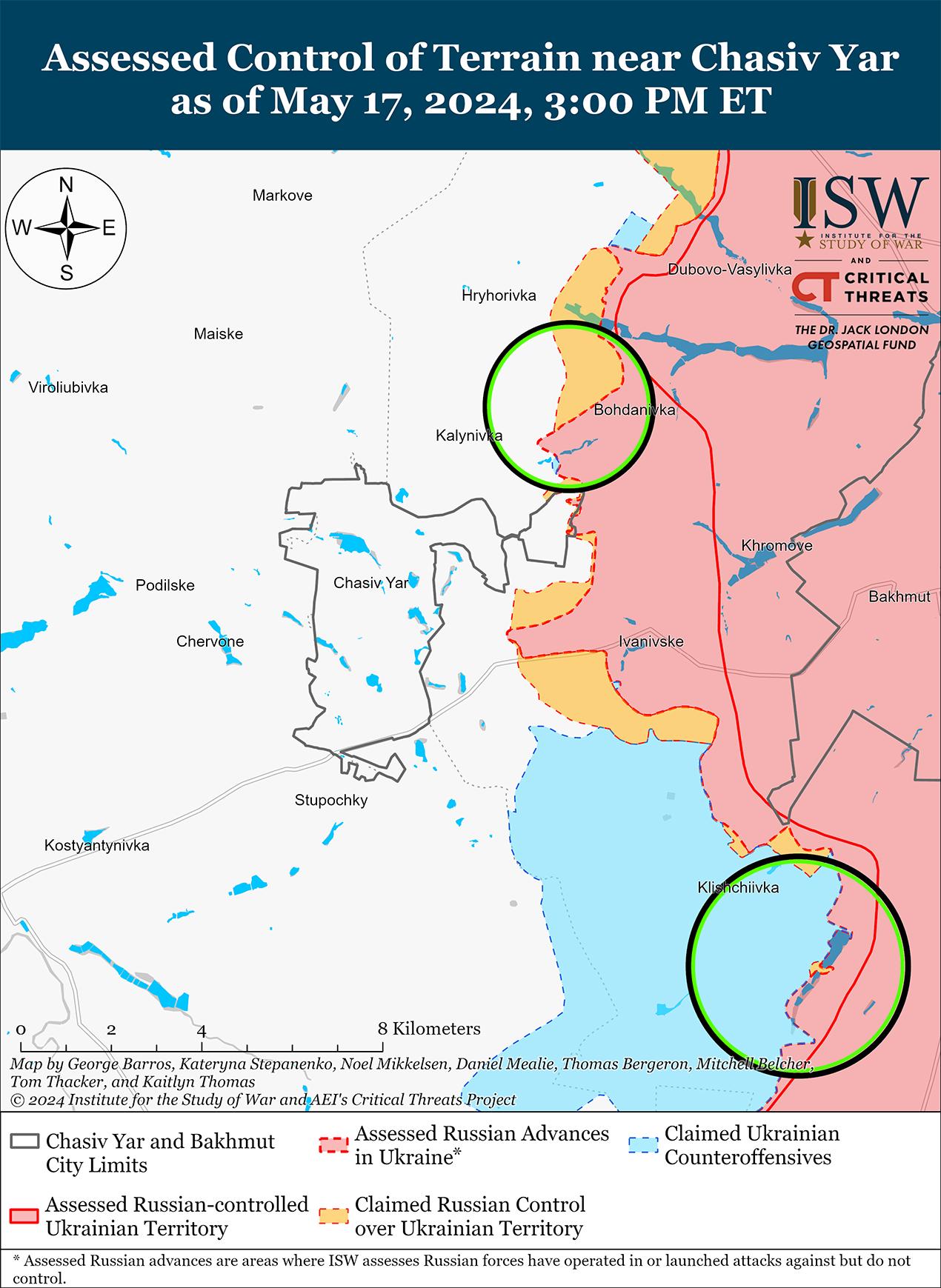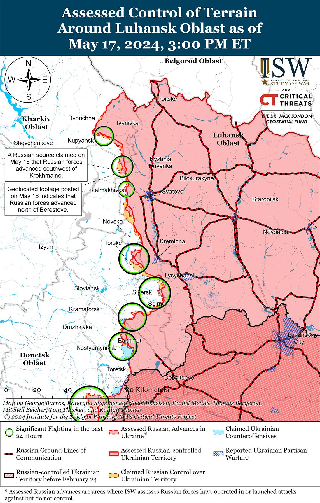 Сообщается, что 17 мая российские войска продвинулись в районе Волчанска, но подтвержденных изменений линии фронта на этом участке не было. Российские военные блогеры утверждали, что российские войска продвинулись к востоку от Тихого (к северо-востоку от Волчанска) и захватили Зыбино (к востоку от Волчанска), но ISW не обнаружил визуальных подтверждений этих заявлений. [45] Украинский сержант, действовавший под Волчанском, сообщил Wall Street Journal, что российские войска контролируют северную половину Волчанска, хотя неясно, имеет ли он в виду весь участок Волчанска к северу от реки Волчья. [46] Однако ISW пока не получил подтверждений того, что российские войска захватили весь Волчанск к северу от реки Волчья. Российские источники утверждали, что российские войска продолжали наступательные действия на севере Волчанска, в районе агрегатного завода и Волчанской центральной районной больницы в центре Волчанска, а также к западу от Волчанска в районе Старицы и Бухруватки. [47] Украинский Генштаб сообщил, что российские войска продолжают наступательные действия в районе Старой и Волчанска. [48] Российский военный блогер утверждал, что российский военнослужащий, недавно действовавший под Волчанском, заявил, что российские войска пытаются компенсировать недостаточный контрбатарейный огонь ударами управляемых планирующих бомб, но у российских войск нет достаточного количества управляемых планирующих бомб. [49] Российские военнослужащие якобы утверждали, что некоторые российские артиллерийские орудия страдают от износа стволов, а украинские беспилотники не позволяют российским войскам выдвигаться на новые огневые позиции.