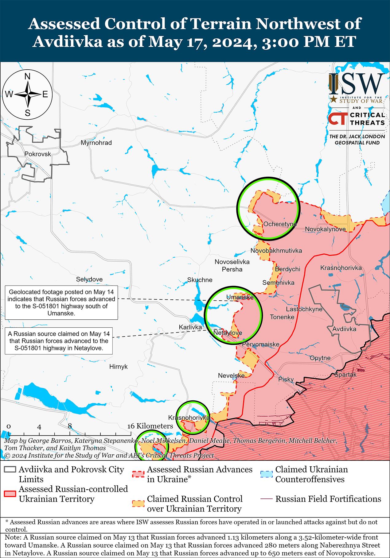 Российские войска недавно продвинулись к северо-западу и западу от Авдеевки на фоне продолжающихся наступательных действий в этом районе 17 мая. На геолоцированных кадрах, опубликованных 15 и 16 мая, видно, что российские войска незначительно продвинулись вдоль бурелома к юго-западу от Соловьево (северо-запад Авдеевки) и вдоль улицы Небережной в западной части Нетайлова (западнее Авдеевки) соответственно. [57] Российские военные блогеры утверждали, что российские войска также продвинулись к востоку от Новоалександровки (северо-западнее Авдеевки), однако ISW не обнаружил визуальных подтверждений российских заявлений. [58] В украинском Генштабе заявили, что украинские силы провели тактическую перегруппировку на неустановленном участке Авдеевского направления в связи с наступательными действиями РФ. [59] Враг также продолжал наземные атаки к северо-западу от Авдеевки в районе Архангельского и Очеретино и к западу от Авдеевки в районе Уманского и Яснобродовки. [60]