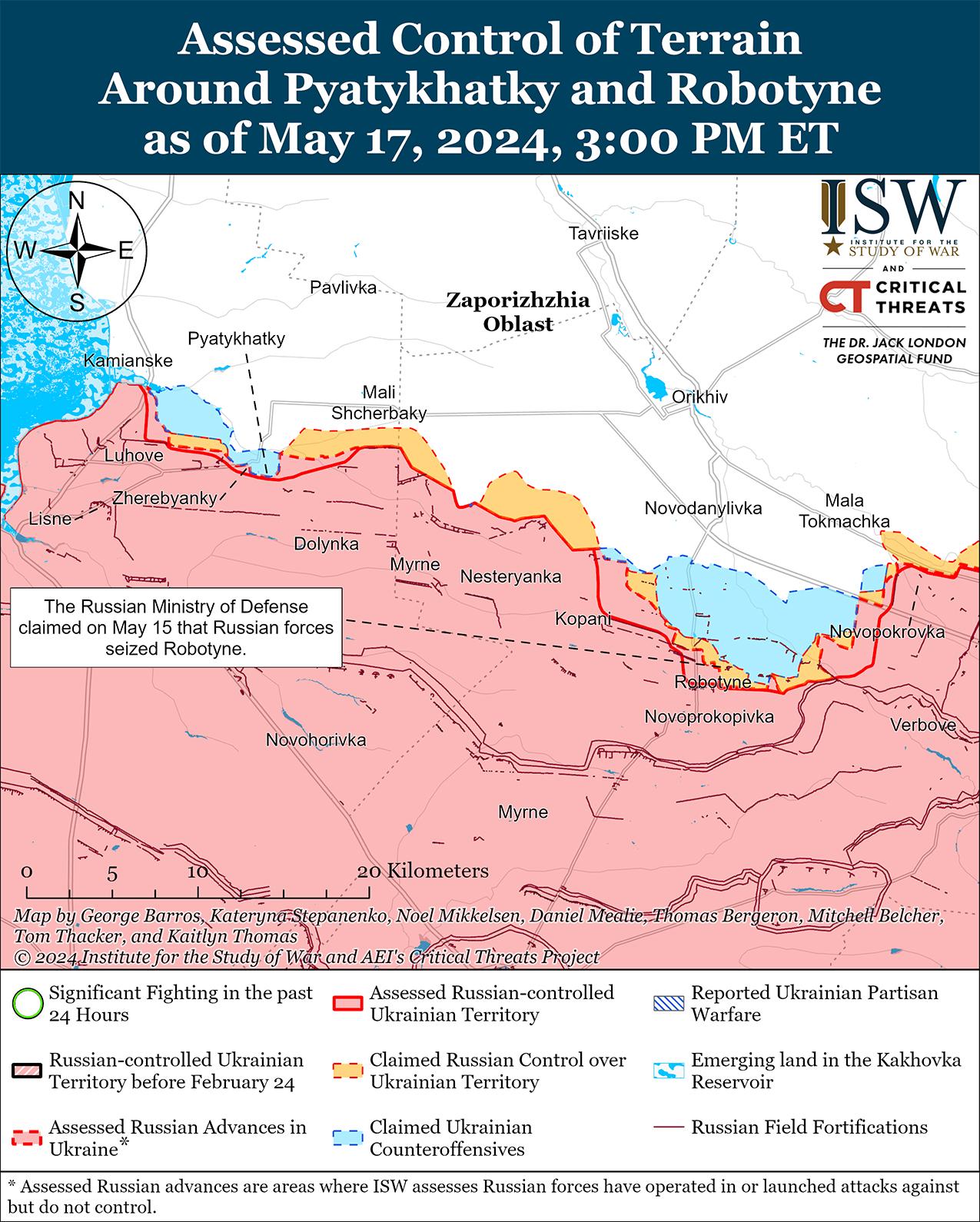 Российские военные блогеры утверждают, что по состоянию на 17 мая российские войска продолжают зачищать Работино, но подтвержденных изменений на линии фронта на западе Запорожской области не было. [66] Официальный представитель Южного оперативного командования Украины капитан третьего ранга Дмитрий Плетенчук заявил 17 мая, что российские войска не захватили Работино. [67] Российские военные блогеры утверждали, что позиционные бои продолжались в районе Вербовое (к востоку от Работино). [68] Сообщается, что в районе Гуляйполя (северо-восточнее Работино) действуют подразделения 37-й мотострелковой бригады (36-я общевойсковая армия, Восточный военный округ) и 69-й бригады прикрытия (35-я ОА, ВВО). [ 69]