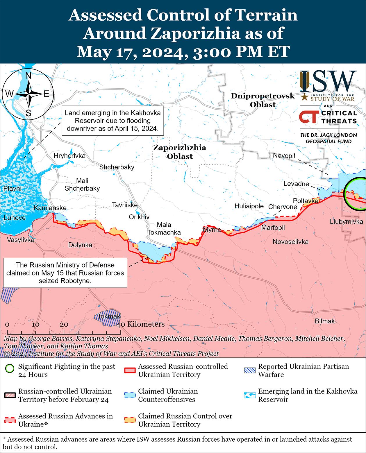 17 мая российские войска продолжили ограниченные наземные атаки в районе границы Донецкой и Запорожской областей в районах населенных пунктов Старомайорское и Урожайное (оба южнее Великой Новоселки). [64] Подразделения 11-й воздушной армии и армии ПВО России (ВКС России и Восточного военного округа [ВВО]) продолжают действовать в районе Урожайного. [65]