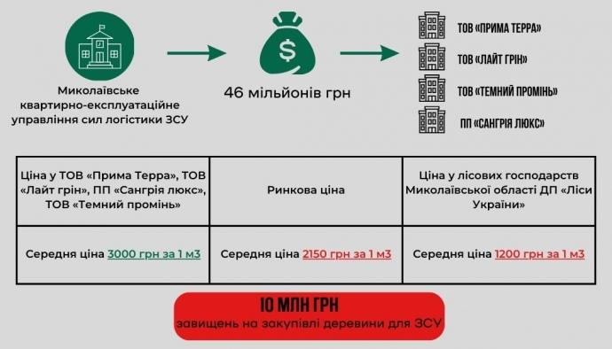 Пізніше це підтвердилось ухвалою Заводського районного суду Миколаєва від 22 квітня. Зокрема, військових службових осіб Миколаївського квартирно-експлуатаційного управління командування сил логістики ЗСУ підозрюють у закупівлі деревини для потреб оборони за завищеними цінами.