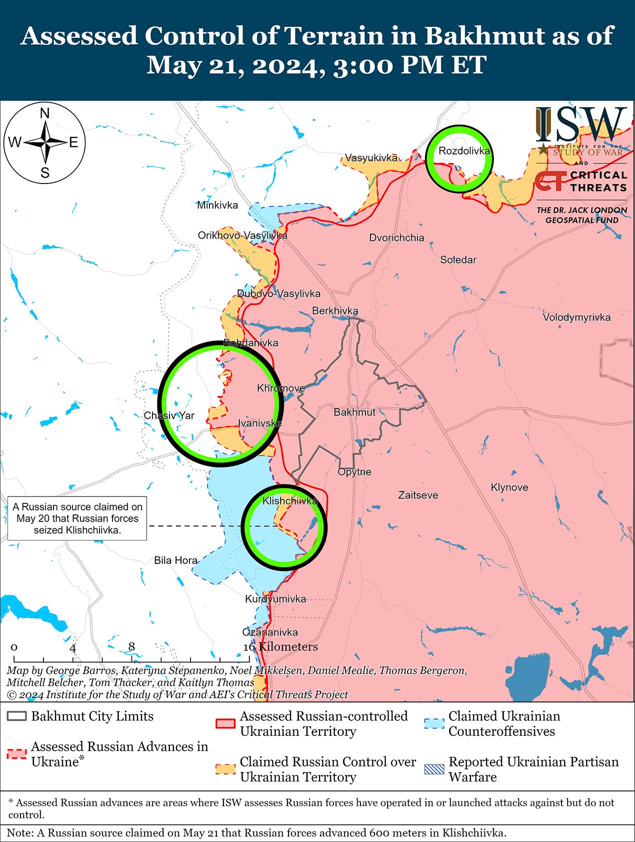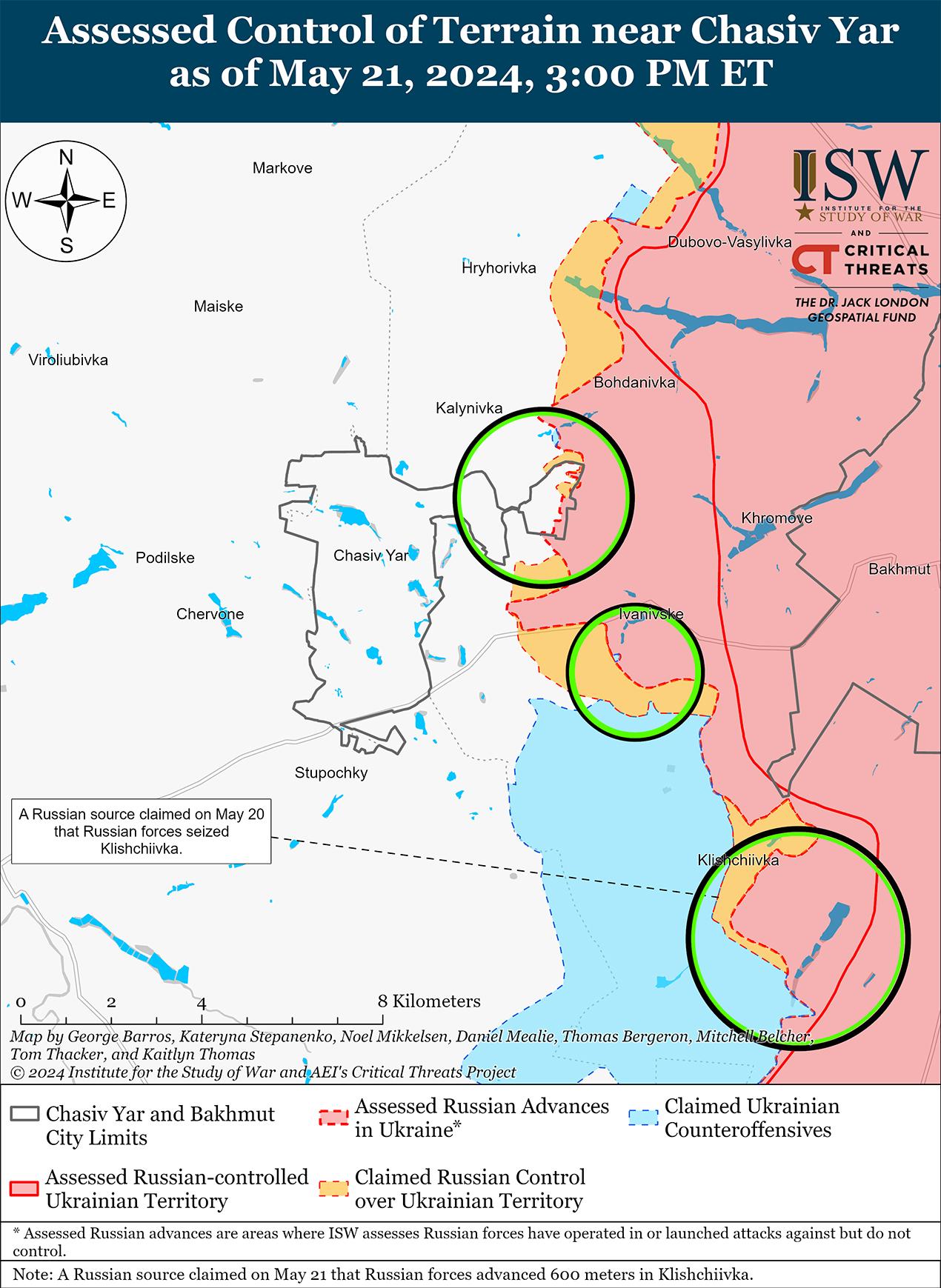 В последнее время враг продвинулся в южной и центральной Клещеевке (юго-восток Часов Яра) и продолжил наступательные действия на Часов Ярском направлении. 21 мая российские военные блогеры распространили видео, на котором, как утверждается, российский танк проезжает через Клещеевку, чтобы доставить штурмовые группы 6-й мотострелковой дивизии (3-й АК) на южную окраину населенного пункта, а затем вернуться на свои неустановленные позиции к северу от населенного пункта. [56] 21 мая российские военные блогеры распространили еще одно видео, на котором, как сообщается, запечатлены действия российских войск в центре Клещеевки. [57] ISW геолоцировал оба видео, подтверждая, что российские войска продвинулись в южной и центральной Клещеевке. Российские источники утверждали, что эти кадры подтверждают, что российские войска полностью захватили Клещеевку и вытеснили украинские силы из населенного пункта, но активно не оккупируют населенный пункт, поскольку украинские силы контролируют господствующую высоту в этом районе. [58] Однако ISW не обнаружил визуальных доказательств того, что российские войска захватили северную и западную Клещеевку. Некоторые российские блогеры утверждали, что российские войска продвинулись всего на 600 метров вдоль центральной дороги в Клещеевке, и что по состоянию на 21 мая бои за населенный пункт все еще продолжаются. [59] Российские источники также утверждали, что российские войска расширили свои позиции в районе заповедника Ступки-Голубовские 2 (юго-восток Часов Яра). [60] Сообщалось, что российские войска продолжали атаковать Часов Яр и микрорайон Канала (самый восточный Часов Яр); и юго-восточнее Часов Яра в районе Ивановского, Клещеевки и Андреевки. [61] Пресс-секретарь украинской Хортицкой группировки войск подполковник Назар Волошин заявил, что украинские силы контролируют Часов Яр и что российских войск в населенном пункте нет. [62] Сообщается, что в районе Часов Яра действуют подразделения российской Интернациональной добровольческой бригады «Пятнашка», 58-го батальона спецназа (1-й ДНР) и 98-й дивизии ВДВ. [63] Сообщается, что на участке Андреевка-Курдюмовка (юго-восточнее Часов Яра) ведут бои подразделения российской 83-й отдельной гвардейской бригады ВДВ, а на бахмутском направлении действуют иностранные наемники из российского «Африканского корпуса». [64]
