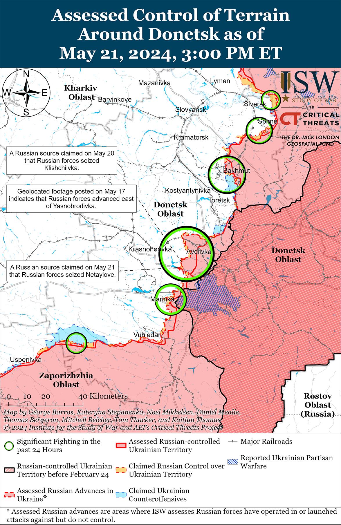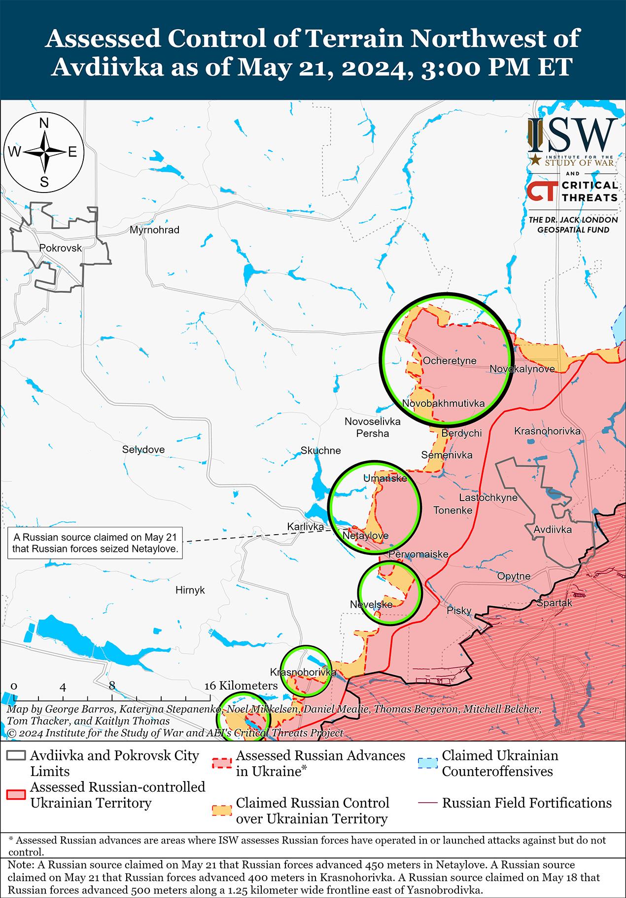 Российские источники утверждали, что российские войска захватили Нетайлово (к западу от Авдеевки) и 21 мая продолжили наступательные действия в районе Авдеевки. Российские источники утверждали, что подразделения российской 9-й мотострелковой бригады (1-й армейский корпус ДНР) и другие неназванные подразделения вынудили украинские силы уйти из Нетайлова. [65] Российские военные блогеры также утверждали, что российские войска продвинулись на 450 метров вглубь Нетайлова и зачищают западную часть населенного пункта, захватив оставшиеся дома в этом районе. [66] Недавно ISW обнаружил геолоцированные кадры, опубликованные 18 мая, на которых видно, что российские войска продвинулись в западной части Нетайлова. [67] 20 мая украинский Генштаб отмечал, что наступательная активность российских войск в районе Нетайлова была интенсивной. [68] Бои продолжались северо-западнее Авдеевки в районах населенных пунктов Калиново, Новоалександровка, Сокол, Прогреcс, Евгеновка, Очеретино, Соловьево, Новоселовка Перша; западнее Авдеевки вблизи Уманского, Северного, Нетайлова и Яснобродовки; и юго-западнее Авдеевки в районе Невельского и Северного. [69] Сообщается, что в районе Очеретино действуют подразделения российской 15-й мотострелковой бригады (2-я гвардейская общевойсковая армия, Центральный военный округ). [70]