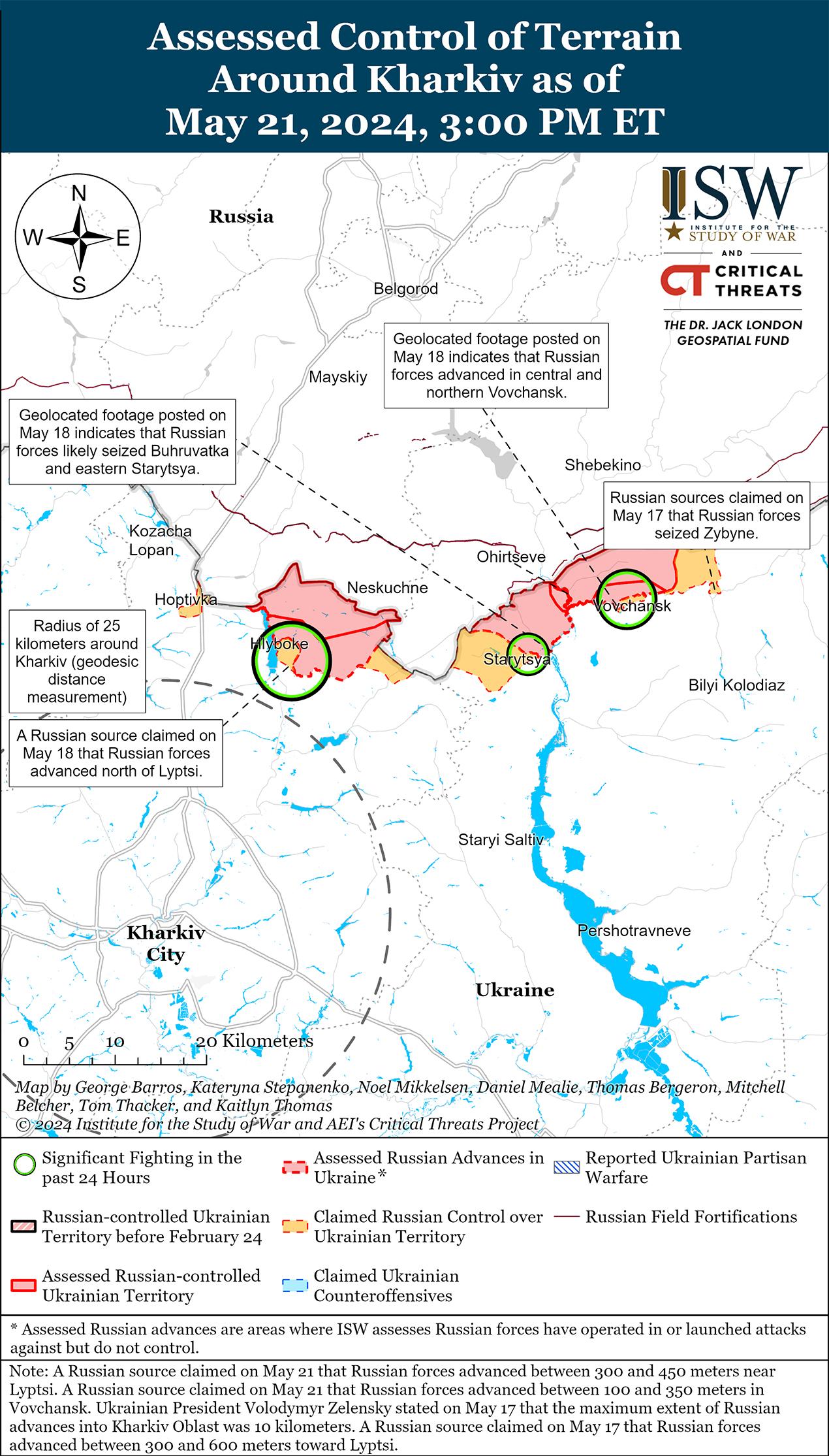 Российские войска не добились каких-либо подтвержденных успехов к северу от Харькова в районе Липцы на фоне продолжающихся боев 21 мая. Российский военный блогер заявил, что российские войска продвинулись на 300-450 метров в направлении Липцы, но ISW не обнаружил визуального подтверждения этому заявлению. [32] Вечером 21 мая украинский Генштаб сообщил, что российские войска значительно активизировали действия на Харьковском направлении после того, как 20 мая количество российских атак уменьшилось. [33]
