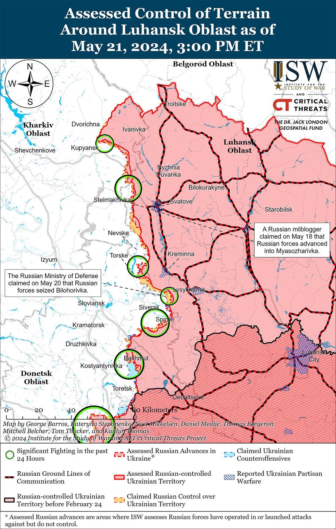 Недавно российские войска подтвердили продвижение по линии Купянск-Сватово-Кременная на фоне продолжающихся наступательных действий в этом районе 21 мая. Геолоцированные кадры, опубликованные 21 мая, свидетельствуют о том, что российские войска продвинулись к юго-востоку от Макеевки (северо-западнее Кременной). [44] Российский военный блогер утверждал, что российские войска продвинулись на километр в районе Макеевки. [45] Российский источник утверждал, что российские войска заняли позиции в 1,18 км вдоль лесного массива к востоку от Стельмаховки (северо-западнее Сватово). [46] Враг продолжал наступательные действия северо-восточнее Купянска в районе Синьковки; северо-западнее Сватово в районе Ивановки, Берестового и Стельмаховки; западнее Кременной в районе Дибровы и Терн; и южнее Кременной возле Григорьевки и Белогоровки. [47]