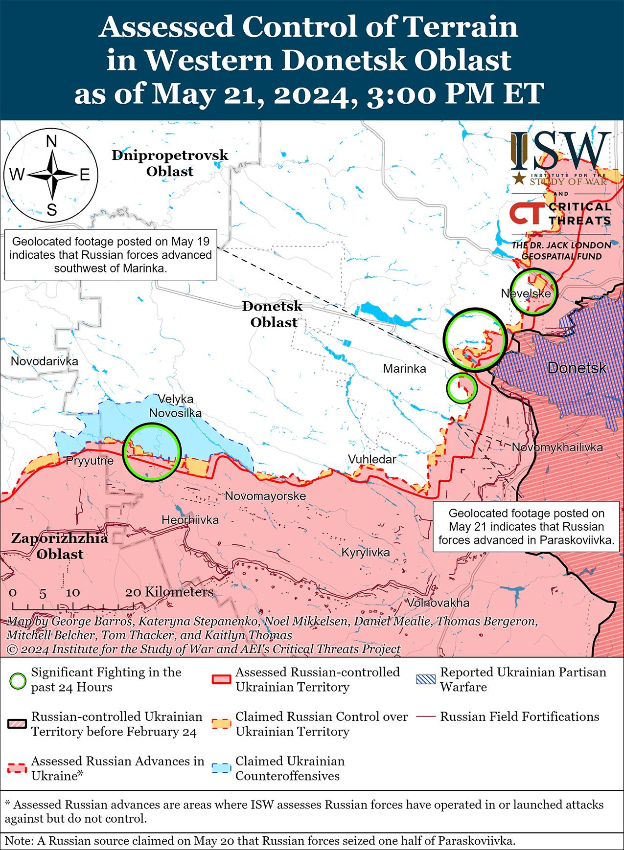 Российские войска недавно незначительно продвинулись к юго-западу от Донецка. На геолоцированных кадрах, опубликованных 21 мая, видно, что российские войска продвинулись к юго-западу от Новомихайловки и в восточной части Парасковиевки (оба к юго-западу от Донецка). [71] Российские источники также утверждали, что российские войска продвинулись на 400 метров в юго-западной части Красногоровки (к западу от Донецка). [72] По имеющимся данным, российские войска атаковали к западу от Донецка в районе Георгиевки и Красногоровки, а также к юго-западу от Донецка в районе Победы и в Парасковиевки. [73] Сообщается, что в Парасковиевке действуют подразделения российского 33-го мотострелкового полка (20-я гвардейская мотострелковая дивизия, 8-я ОА, Южный военный округ); Сообщается, что подразделения российской 238-й артиллерийской бригады (8-й ОА), спецназа «Грачи» и 5-й дивизии (головное формирование неизвестно) действуют в районе Красногоровки. [74] Сообщается, что на Донецком направлении действуют подразделения российского 87-го отдельного стрелкового полка (бывший 119-й полк 1-го АК ДНР); сообщается, что в районе Угледара действуют подразделения российской 14-й гвардейской бригады специального назначения (подчинена Главному разведывательному управлению Генштаба). [75]
