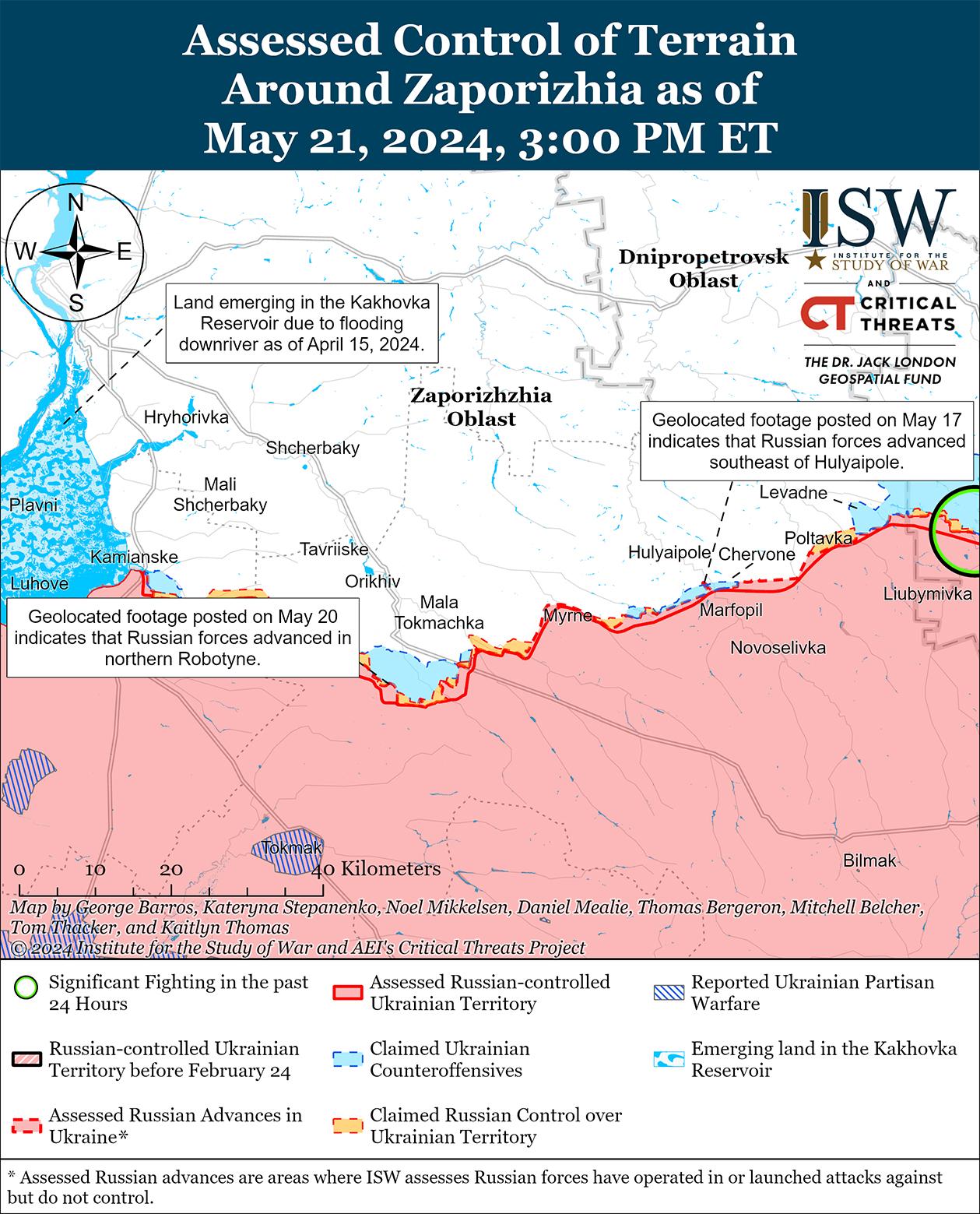 21 мая на западе Запорожской области продолжались позиционные бои, однако подтвержденных изменений на линии фронта в этом районе не было. Спикер Южного оперативного командования и ВМС Украины капитан третьего ранга Дмитрий Плетенчук заявил, что российские войска не захватили Работино. [77] Российские военные блогеры утверждали, что российские войска продвинулись на 3,5 километра по фронту и на один километр в глубину к юго-востоку от Работино, хотя ISW не обнаружил визуальных доказательств этого заявления. [78] Продолжались позиционные бои в районе Работино и Вербовое (к востоку от Работино). [79]