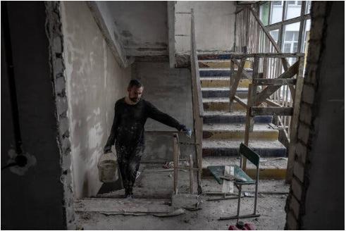Рабочий восстанавливает школу в городе Старый Салтов, который был оккупирован российскими войсками в 2022 году и сейчас находится под угрозой нового российского наступления на севере Харьковской области.