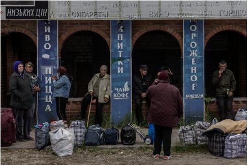 Жители, эвакуированные из сел под Волчанском, ожидают на перевалочном пункте отправки в областной центр Харьков.