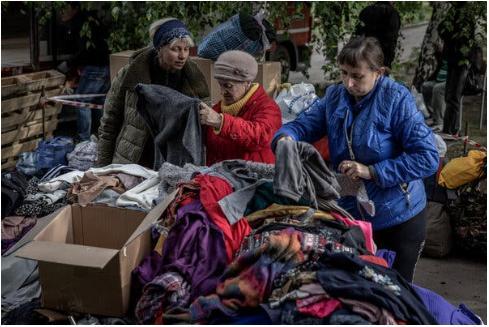 Женщины, эвакуированные из своих домов под Волчанском и окрестных сел, подвергшихся обстрелам, просматривают пожертвованную одежду в центре гуманитарной помощи.