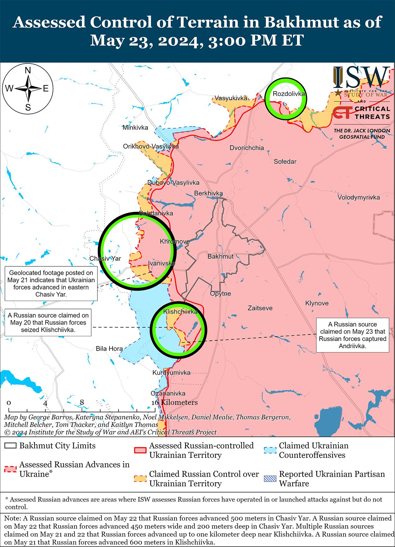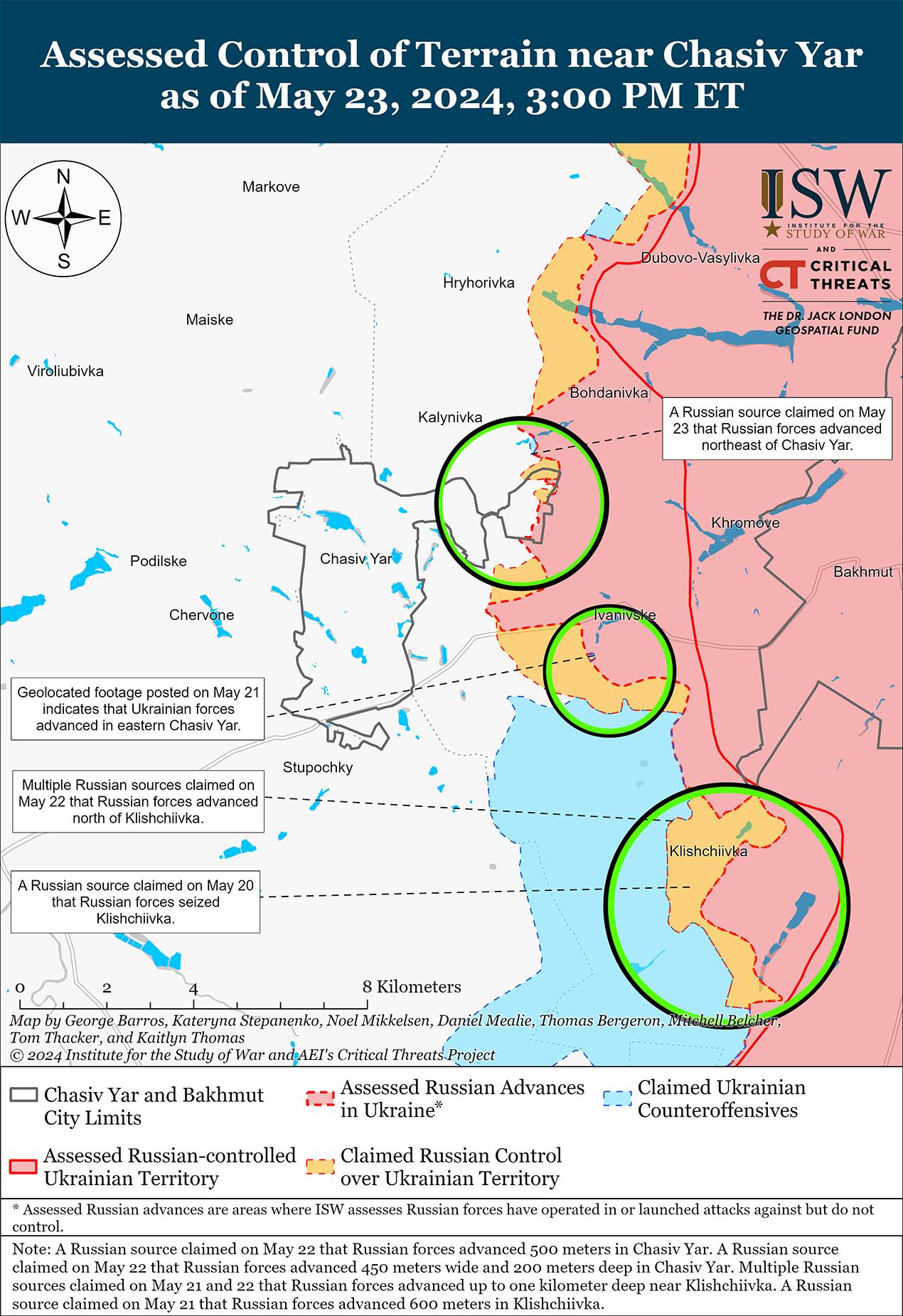Сообщается, что 23 мая российские войска продвинулись в районе Часова Яра, но подтвержденных изменений линии фронта на этом участке не было. Министерство обороны России заявило, что российские войска захватили Андреевку (юго-восточнее Часова Яра). [57] Российские военные блогеры утверждали, что российские войска продвинулись на северо-восточных окраинах микрорайона Канал (самый восточный Часов Яр), в пределах канала и в районе Нового микрорайона (восточный Часов Яр). [58] Российский военный блогер утверждал, что российские войска продвинулись на глубину до 800 метров и по фронту 1,55 км в северной части заповедника Ступки-Голубовские 2 (юго-восток Часова Яра). [59] ISW не обнаружил визуальных подтверждений этих российских заявлений. Также продолжались бои к востоку от Часова Яра в районе Ивановского и юго-восточнее Часова Яра в районе Клещеевки. [60] Украинский главнокомандующий генерал-полковник Александр Сырский заявил, что российские войска пытаются захватить Часов Яр «любой ценой» и используют в этом районе танки Т-90 и боевые машины пехоты (БМП), которые украинские силы уничтожают противотанковыми комплексами и беспилотниками с видом от первого лица. [61] Сообщается, что в районе Часова Яра действуют подразделения российского 58-го батальона спецназа (1-й армейский корпус Донецкой Народной Республики) и бригады «Север-В» (Российский добровольческий корпус), а в районе Нового – подразделения 98-й воздушно-десантной дивизии (ВДВ). [62]