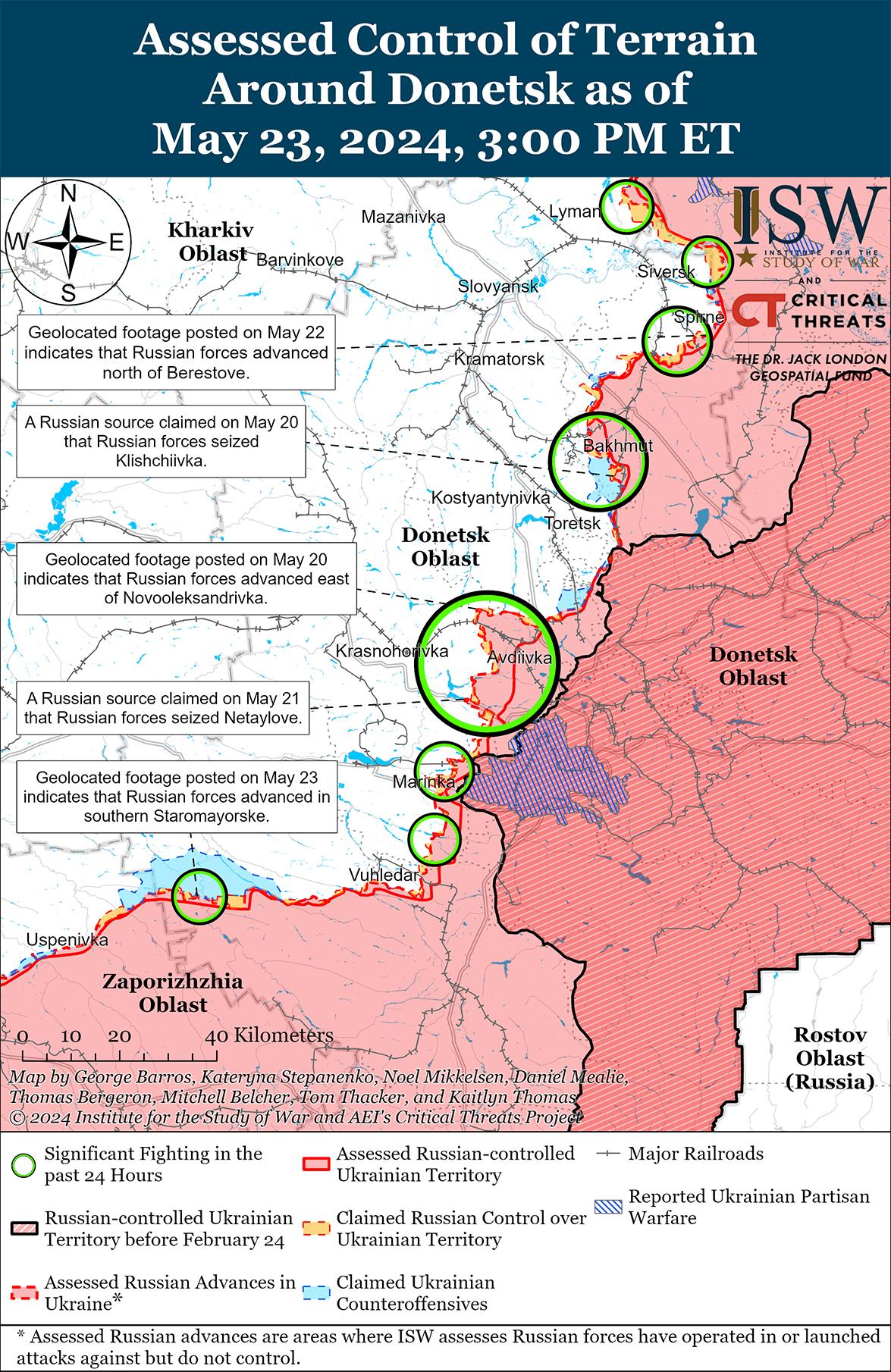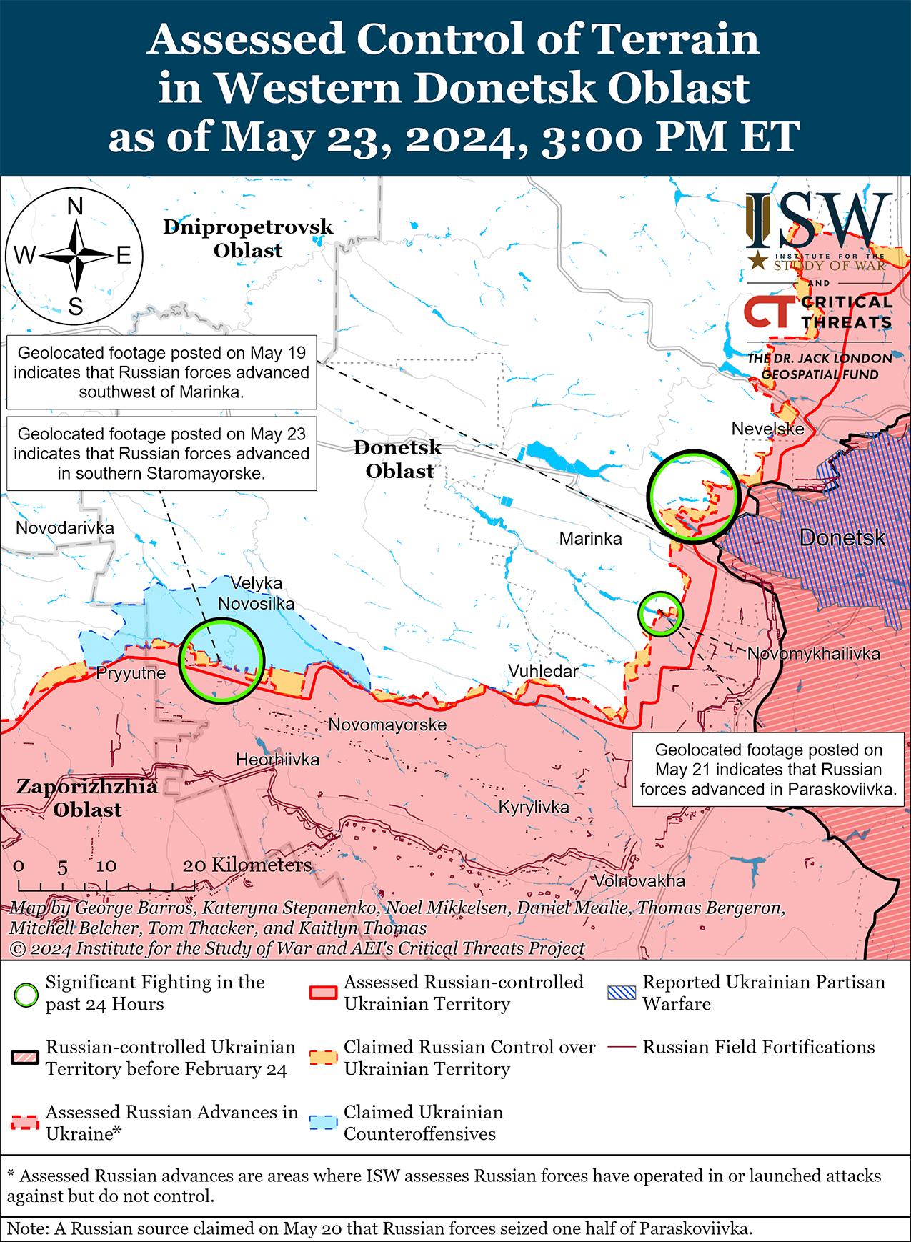 Недавно российские войска продвинулись в приграничном районе Донецкой и Запорожской областей. Геолоцированные кадры, опубликованные 23 мая, свидетельствуют о том, что российские войска на мотоциклах недавно продвинулись в центр Старомайорского (к югу от Великой Новоселки). [70] Российский блогер утверждал, что российские штурмовые группы используют мотоциклы в районе Старомайорского, потому что они могут более эффективно уклоняться от ударов украинской артиллерии и беспилотников FPV, чем бронетехника. [71] Бои продолжались и южнее Великой Новоселки в районе Урожайное. [72]