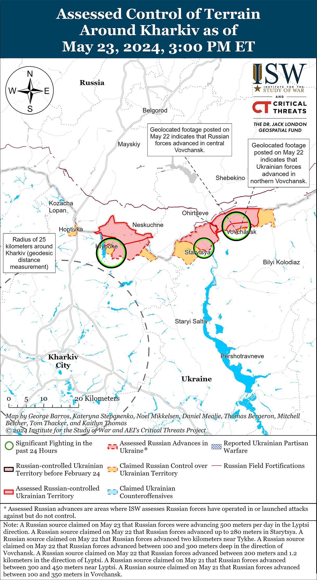 Украинские силы недавно отвоевали маргинальную территорию к северу от Харькова на фоне продолжающихся российских наземных атак в этом районе 23 мая. Геолоцированные кадры, опубликованные 22 мая, показывают, что украинские силы недавно незначительно продвинулись к юго-востоку от Лукьянцев (к северо-востоку от Липцы). [41] Российские войска продолжали наземные атаки в районе Липцы, и российские источники утверждали, что украинские силы контратаковали в районе Липцы и Глубокое (к северу от Липцы). [42] Российские военные блогеры утверждали, что российские войска продвинулись на глубину до 500 метров в районе Липцы, однако ISW не обнаружил визуального подтверждения этого заявления. [43] Украинский главнокомандующий генерал-полковник Александр Сырский заявил, что российские войска перешли к активной обороне на Липцынском направлении. [44]