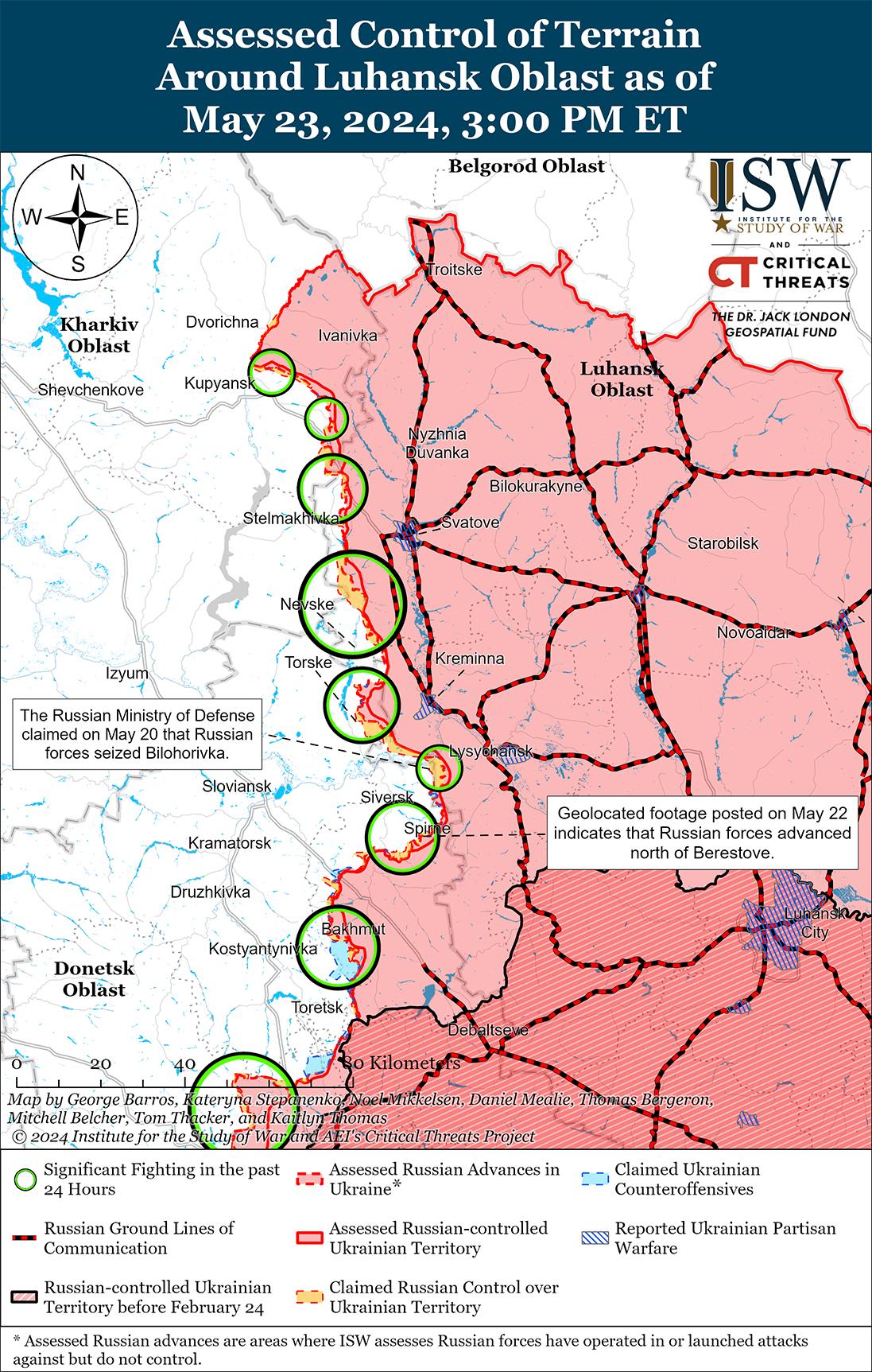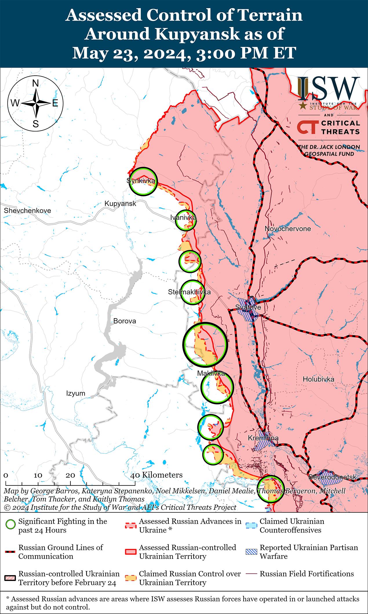 Украинские силы недавно незначительно продвинулись к югу от Кременной на фоне продолжающихся российских наземных атак вдоль линии Купянск-Сватово-Кременная 23 мая. Геолоцированные кадры, опубликованные 23 мая, свидетельствуют о том, что украинские войска недавно незначительно продвинулись к северу от Белогоровки (к югу от Кременной). [49] 23 мая украинский главнокомандующий генерал-полковник Александр Сырский сообщил, что российские войска продолжают наступление в лесных массивах к северу от Купянска и пытаются прорвать украинскую оборону в районе Кисловки (юго-восточнее Купянска), чтобы выйти к реке Оскол. [50] Российский военный блогер утверждал, что российские войска продвигаются вдоль железнодорожной ветки к северу от Кисловки в направлении Ивановки (юго-восточнее Купянска) и ведут разведку боем в районе южных окраин Ивановки. [51] Российский военный блогер опроверг заявление Министерства обороны России от 20 мая о том, что российские войска захватили Белогоровку (к югу от Кременной), и заявил, что российские войска добились лишь ограниченных успехов в этом районе ценой значительных потерь в живой силе. [52] Военный блогер утверждал, что российские войска теряли несколько сотен военнослужащих в день во время лобовых атак пехоты на Белогоровку в феврале 2024 г. и что российские войска временно приостановили наступление на Белогоровку в конце апреля, но возобновили наступление в начале мая после прибытия в этот район подкрепления. Враг также вел штурмовые действия к северо-востоку от Купянска в районе Синьковки; юго-восточнее Купянска в районе Берестова и Стельмаховки; юго-западнее Сватово вблизи Новоегоровки, Грековки, Невского, Макеевки, Дружелюбовки и Нововодяного; западнее Кременной в районе Терны и Торское; и южнее Кременной возле Григорьевки и Белогоровки. [53]