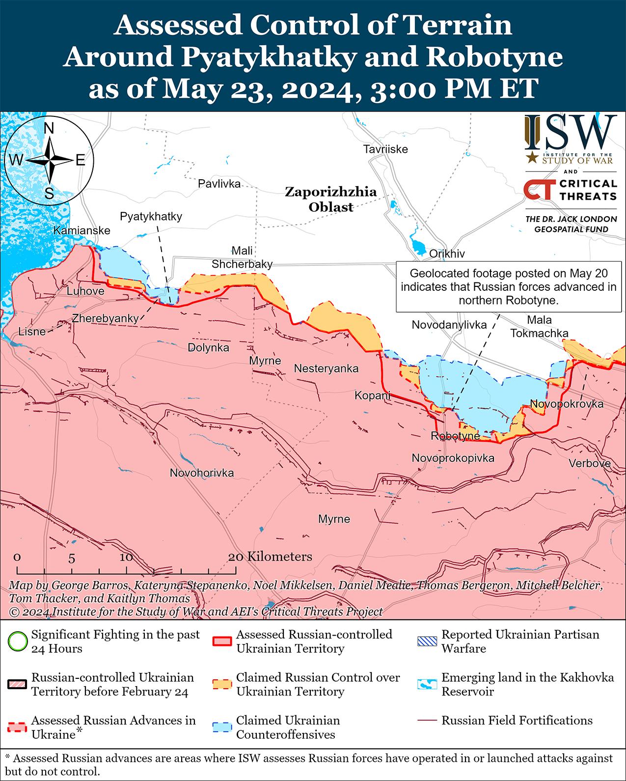 Пресс-секретарь украинского подразделения, действующего в районе Работино, заявил 22 мая, что украинские силы контролируют Работино, опровергнув недавнее заявление Министерства обороны России о том, что российские войска захватили населенный пункт. [73] По словам пресс-секретаря, на окраинах Работино действуют российские военнослужащие на мотоциклах по бездорожью и небольшие группы, ведущие разведку боем. 23 мая российские военные блогеры заявили, что российские войска захватили две неназванные позиции при наступлении к северо-западу от Вербовое (к востоку от Работино), хотя ISW не обнаружил подтверждения этого заявления. [74] Сообщается, что в районе Работино действуют подразделения российского 70-го мотострелкового полка (42-я мотострелковая дивизия, 58-я общевойсковая армия, Южный военный округ). [75]