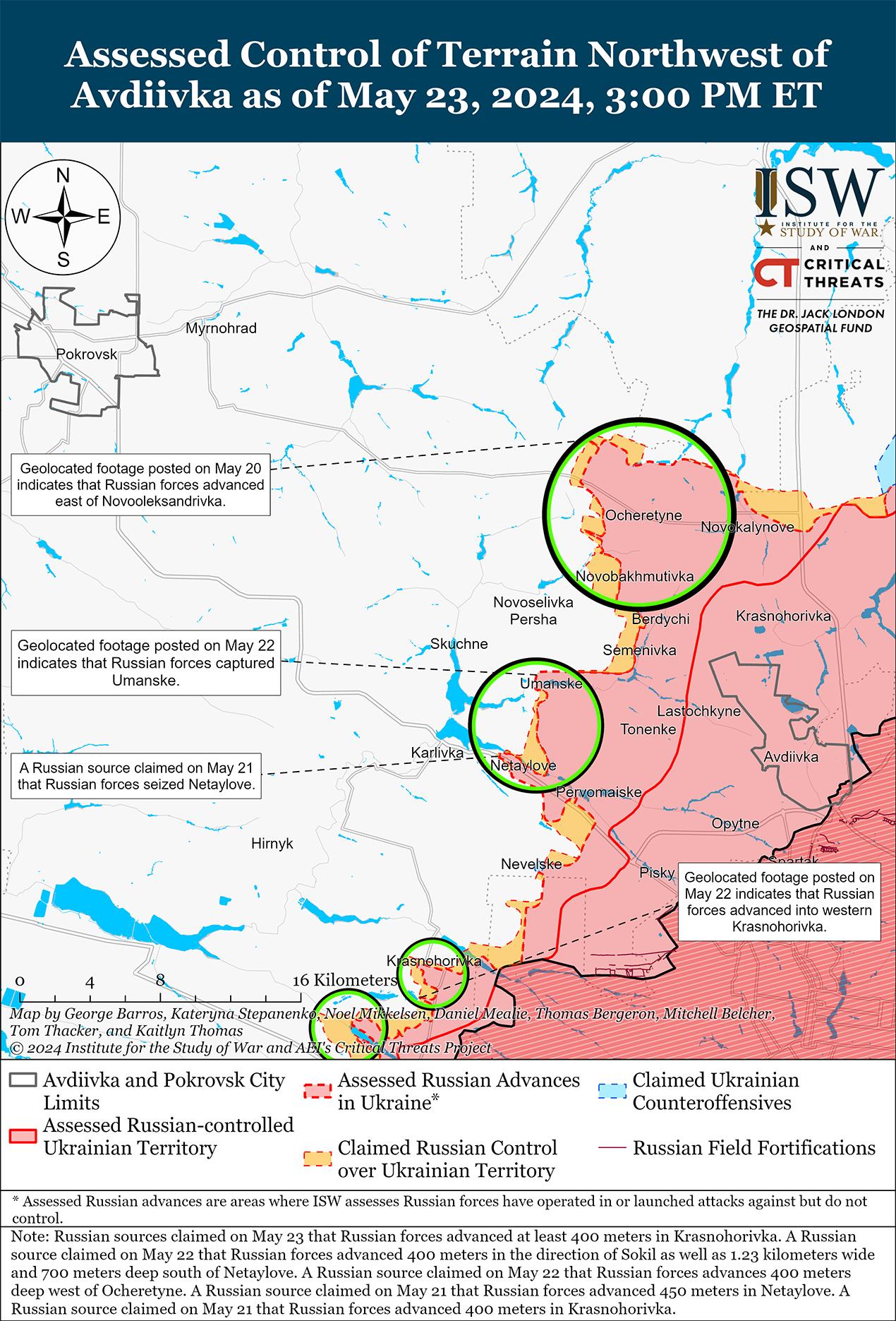 Российские войска недавно продвинулись к западу и северо-западу от Авдеевки на фоне продолжающихся наступательных действий в этом районе 23 мая. Геолоцированные кадры, опубликованные 22 мая, на которых видно, как украинские войска наносят удар по российскому пункту снабжения боеприпасами на северо-западе Уманского, вероятно, указывают на то, что российские войска недавно захватили Уманское (к западу от Авдеевки). [63] Российские войска, скорее всего, создадут пункт снабжения боеприпасами только в прифронтовом населенном пункте, находящемся под контролем России. Дополнительные геолоцированные кадры, опубликованные 22 мая, свидетельствуют о том, что российские войска продвинулись к западу от Бердичей (северо-западнее Авдеевки). [64] Бои продолжались и севернее Авдеевки в районе Калиново; северо-западнее Авдеевки вблизи Очеретино, Новоалександревки, Архангельского, Сокола, Новопокровского и Соловьево; и к западу от Авдеевки возле Нетайлова. [65] Сырский заявил, что наиболее интенсивные бои идут на Покровском (Авдеевка) и Кураховском (западнее и юго-западнее Донецка) направлениях, а наиболее подготовленные российские подразделения пытаются прорваться между Бердичами и Старомихайловкой (западнее Донецка). [66] Сырский заявил, что российские войска ведут механизированные и пехотные атаки, иногда используют мотоциклы и квадроциклы. Сообщается, что подразделения российской 114-й мотострелковой бригады (1-й АК ДНР) действуют в районе Уманского, а подразделения 27-й мотострелковой дивизии (2-я ОА, Центральный военный округ [ЦВО]), как сообщается, действуют в районе Сокола. [67]