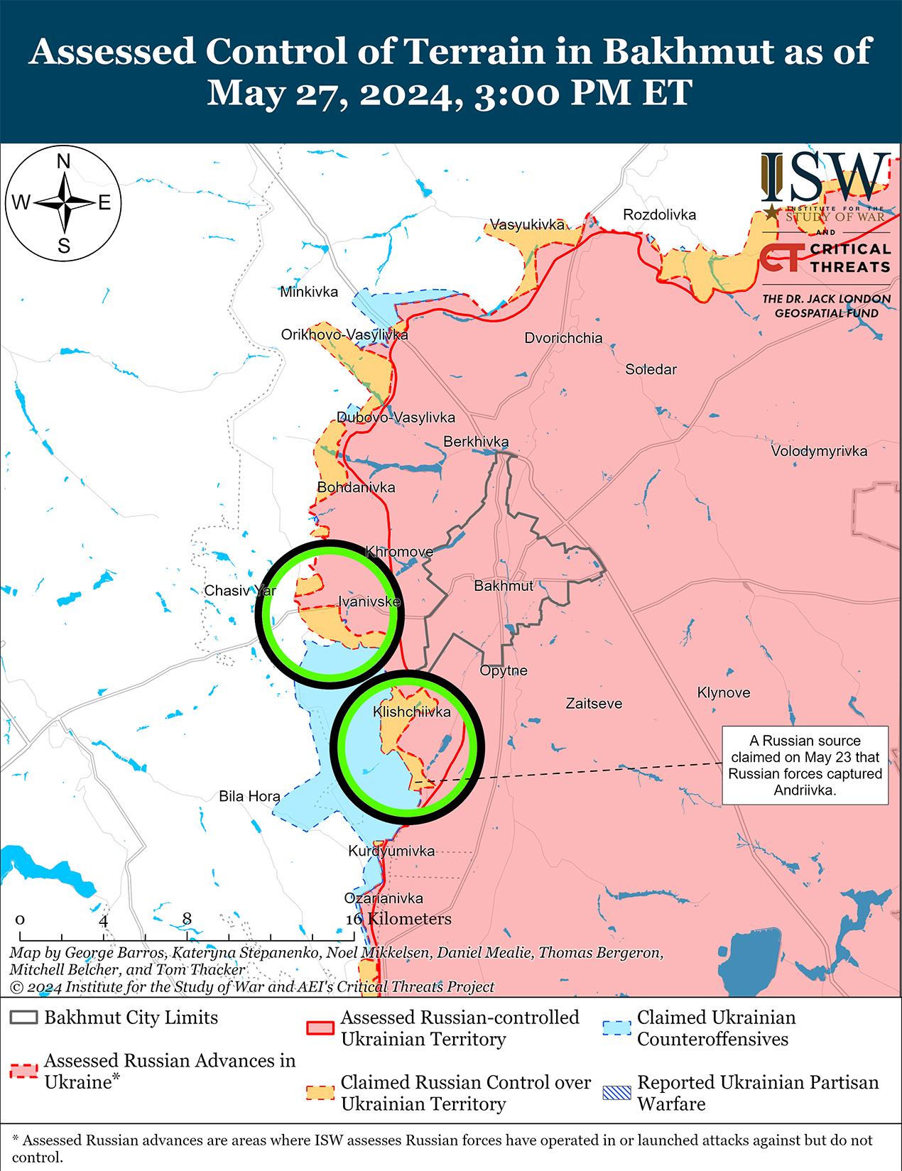 27 мая враг продолжил наступательные действия в районе Часова Яра, однако подтвержденных изменений на линии фронта в этом районе не было. Российский блогер заявил, что российские войска продвинулись на фронта до 720 метров на восточной и южной окраинах микрорайона Канал (самый восточный район Часова Яра), хотя ISW не обнаружил визуальных доказательств этого утверждения. [53] Российские войска также продолжали наземные атаки в районе микрорайона Нового (восток Часова Яра), к востоку от Часова Яра в районе Ивановского и к юго-востоку от Часова Яра в районе Клещеевки и Андреевки. [54] Сообщается, что на Бахмутском направлении (Часов Яр) действуют подразделения российской 85-й мотострелковой бригады (2-й армейский корпус ЛНР). [55]
