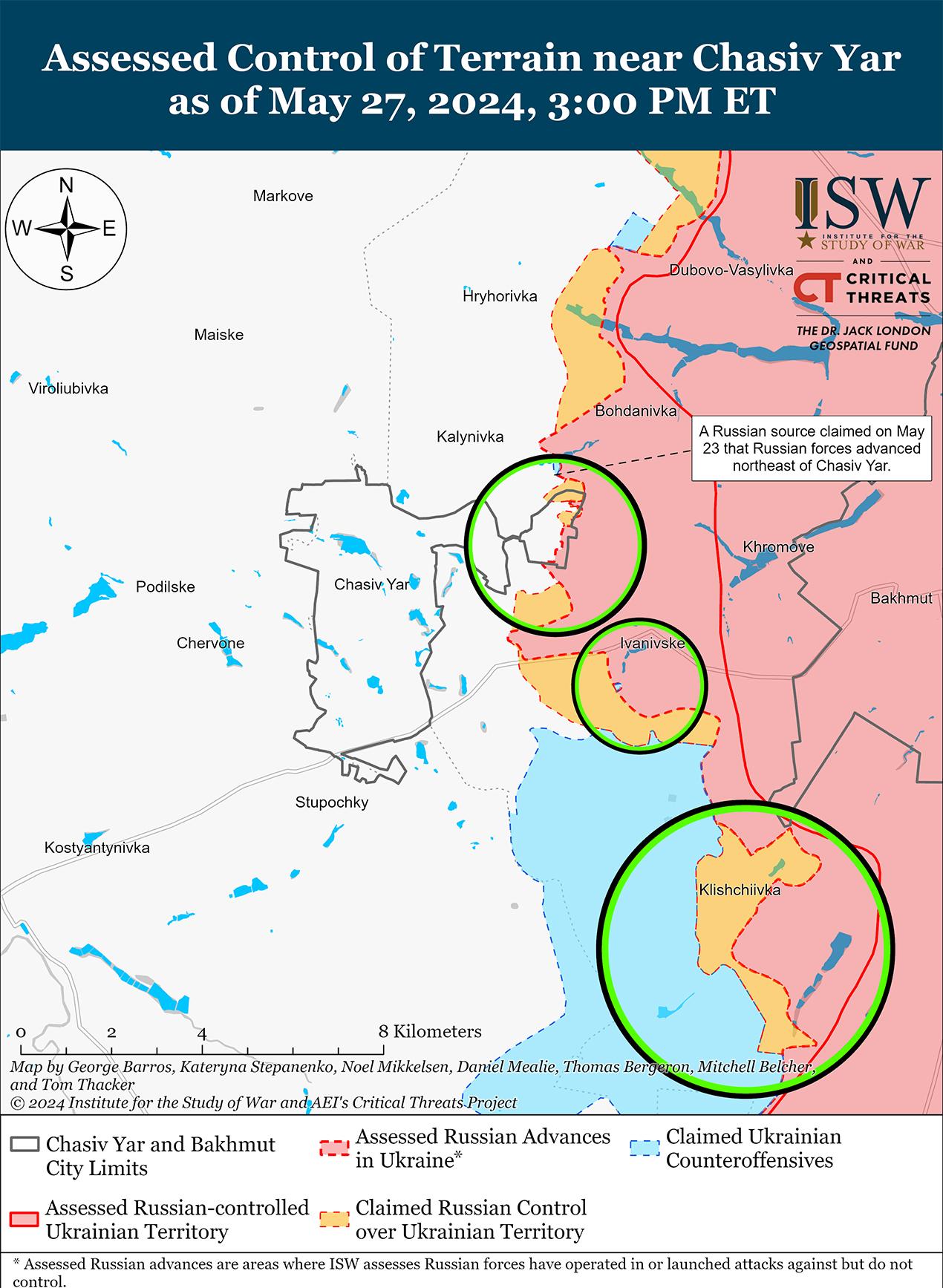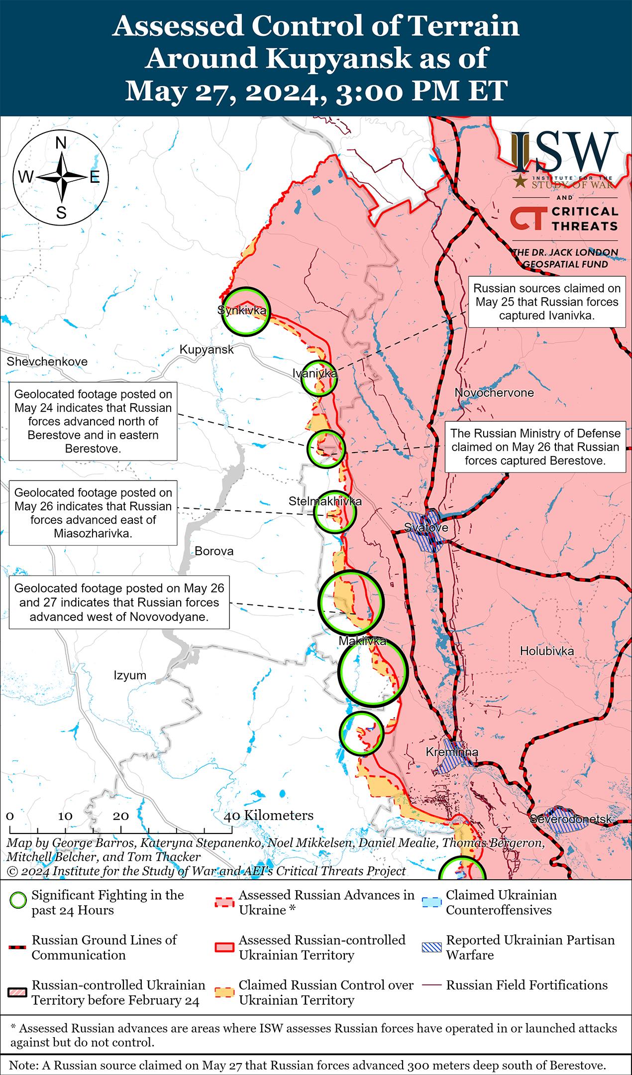 Российские войска недавно подтвердили продвижение вдоль линии Купянск-Сватово-Кременная на фоне продолжающихся наступательных действий в этом районе 27 мая. Геолоцированные кадры, опубликованные 26 мая, свидетельствуют о том, что российские войска недавно продвинулись к востоку от Мясожаровки (к западу от Сватово). [44] На дополнительных геолоцированных кадрах, опубликованных 26 и 27 мая, видно, что российские войска недавно продвинулись к западу от Нововодяного (юго-западнее Сватово). [45] Министерство обороны России заявило, что российские войска захватили Ивановку (юго-восточнее Купянска). [46] Российские военные блогеры утверждали, что российские войска продвинулись в направлении Стельмаховки (северо-запад Сватово), северо-западнее Новоселовского (северо-запад Сватово), 300 метров в районе Берестовое (северо-запад Сватово) и в районе Белогоровки (к югу от Кременной). [47] Однако ISW не обнаружил подтверждения этим заявлениям России. [48] Известный российский блогер заявил, что имеющиеся кадры лишь частично подтверждают заявление Минобороны РФ от 26 мая о том, что российские войска захватили Берестовое, но село настолько маленькое, что не исключено, что российские войска захватили весь населенный пункт. [49] Продолжались наступательные действия северо-восточнее Купянска в районе Синьковки; восточнее Купянска в районе Петропавловки и Кисловки; северо-западнее Сватово в районе Ивановки, Степной Новоселовки и Берестовой; западнее Сватово в районе Мясожаровки; юго-западнее Сватово в районе Грековки, Дружелюбовки, Новоегоровки и Нововодяного; северо-западнее Кременной в районе Невского; западнее Кременной в районе Терны; и южнее Кременной возле Григорьевки и Белогоровки. [50]