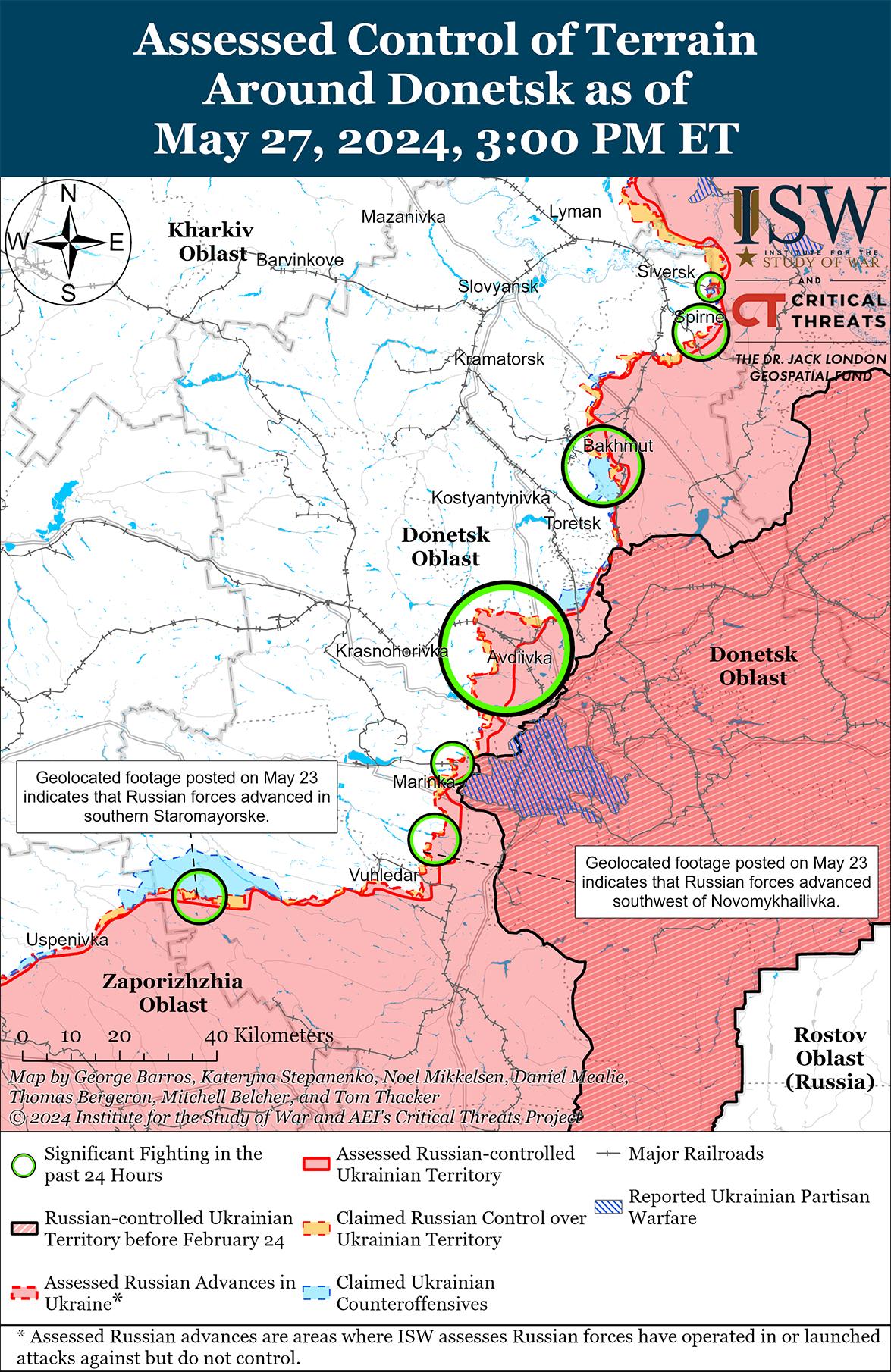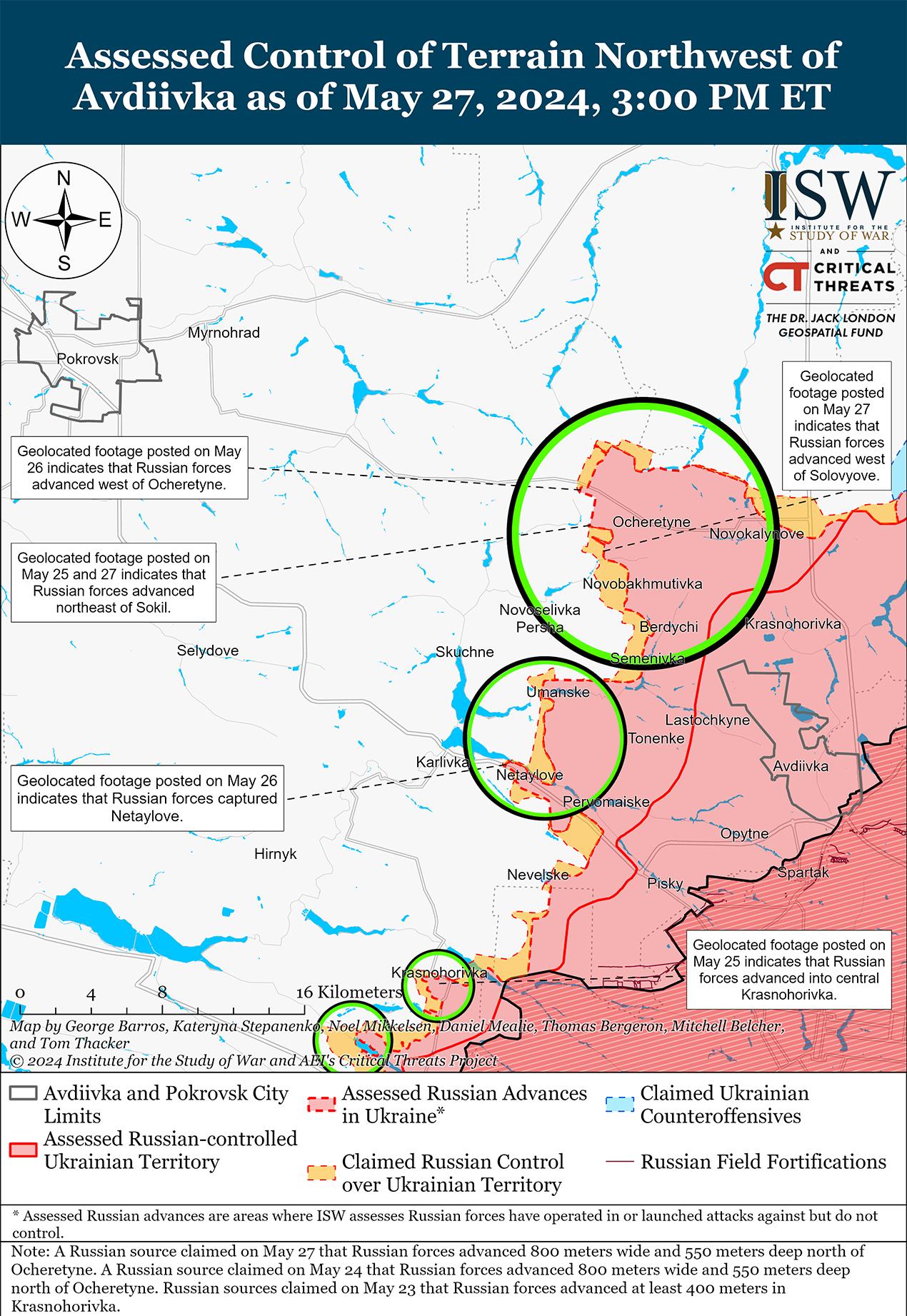 Российские войска недавно подтвердили продвижение к северо-западу от Авдеевки на фоне продолжающихся российских наступательных операций в этом районе 27 мая. Геолоцированные кадры, опубликованные 25, 26 и 27 мая, свидетельствуют о том, что российские войска недавно продвинулись к западу от Очеретино (к северо-западу от Авдеевки), к северо-востоку от Сокола (к северо-западу от Авдеевки) и к западу от Соловьево (к северо-западу от Авдеевки). [56] Министерство обороны России утверждало, что российские войска захватили Нетайлово (к западу от Авдеевки), а российские военные утверждали, что российские войска продвинулись к северо-западу и югу от населенного пункта. [57] Российские войска, вероятно, захватили Нетайлово по состоянию на 26 мая. [58] Российский военный блогер утверждал, что российские войска продвинулись к северу от Очеретино на 800 метров по фронту и 550 метров в глубину. [59] Бои продолжались и к северу от Авдеевки в районе Калиново; северо-западнее Авдеевки вблизи Новоалександровки и Новоселовки Першей; западнее Авдеевки в районе Уманского и Яснобродовки; и юго-западнее Авдеевки в районе Невельского. [60]