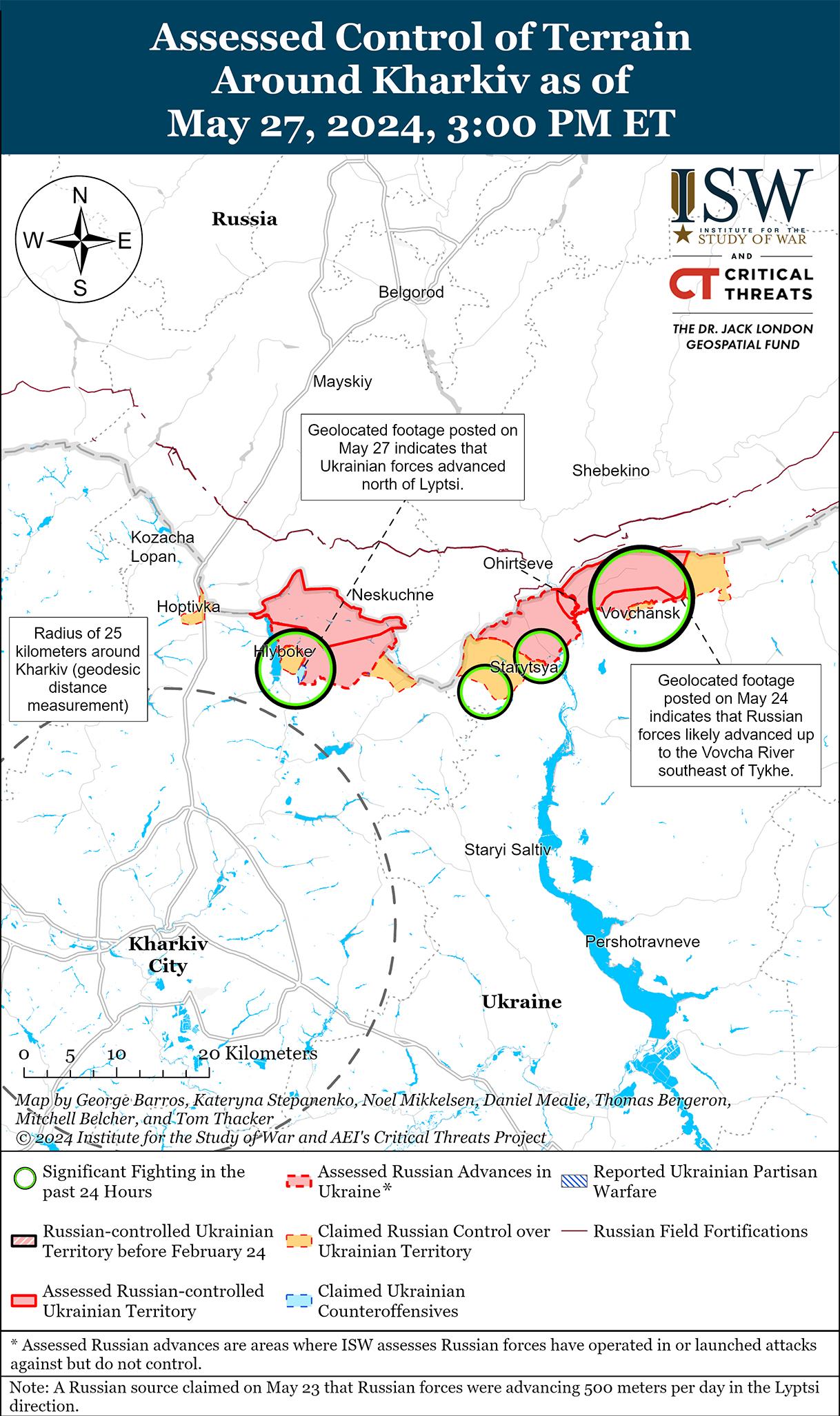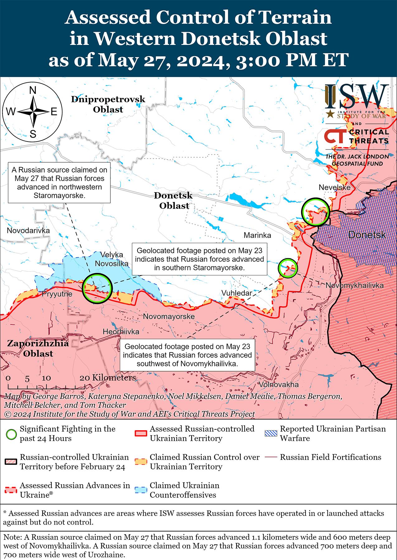 Сообщается, что 27 мая российские войска продвинулись в приграничном районе Донецкой и Запорожской областей, однако подтвержденных изменений линии фронта в этом районе не было. Российские военные блогеры утверждали, что российские войска продвинулись на северо-западе Старомайорского (к югу от Великой Новоселки). [64] Российский военный блогер утверждал, что российские войска продвинулись до 700 метров по фронту и 700 метров в глубину к западу от Урожайного (к югу от Великой Новоселки). [65] ISW не обнаружил визуальных доказательств этих заявлений. В украинском Генштабе сообщили, что украинские силы отразили российские атаки вблизи Старомайорского и Урожайного. [66] Сообщается, что на направлении Великая Новоселка действуют подразделения российской 5-й танковой бригады (36-я общевойсковая армия, Восточный военный округ), а в районе Урожайного – подразделения 11-й воздушной армии и армии ПВО (ВКС РФ и ВВО). [67]