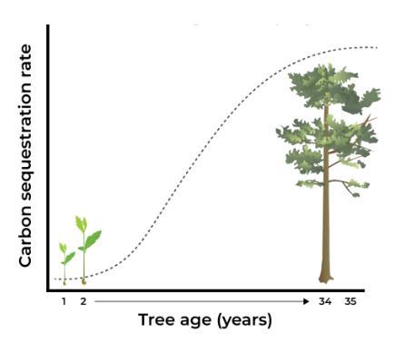 График, показывает изменение способности деревьев улавливать углерод по мере их старения; © Carbon Neutral, Австралия