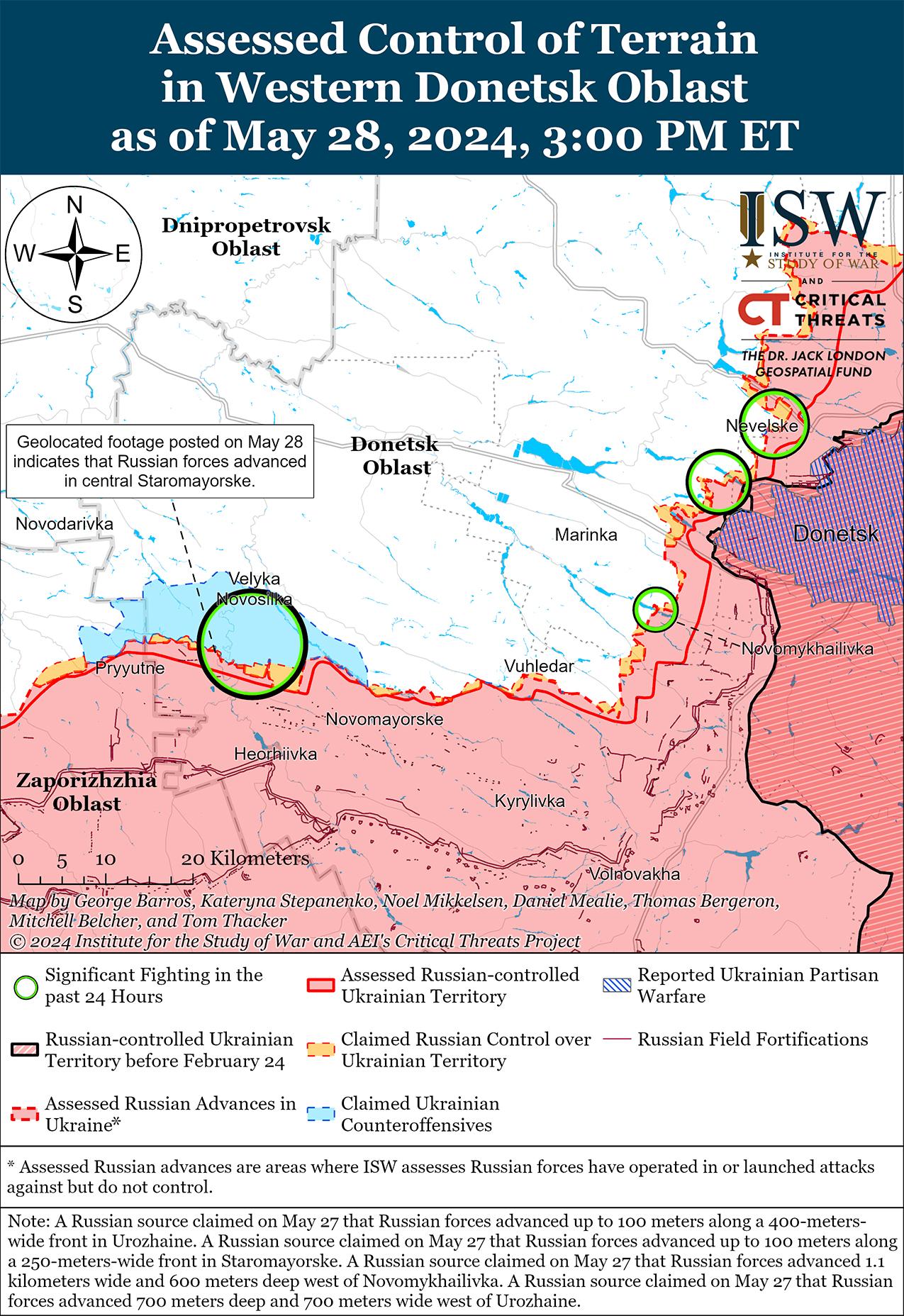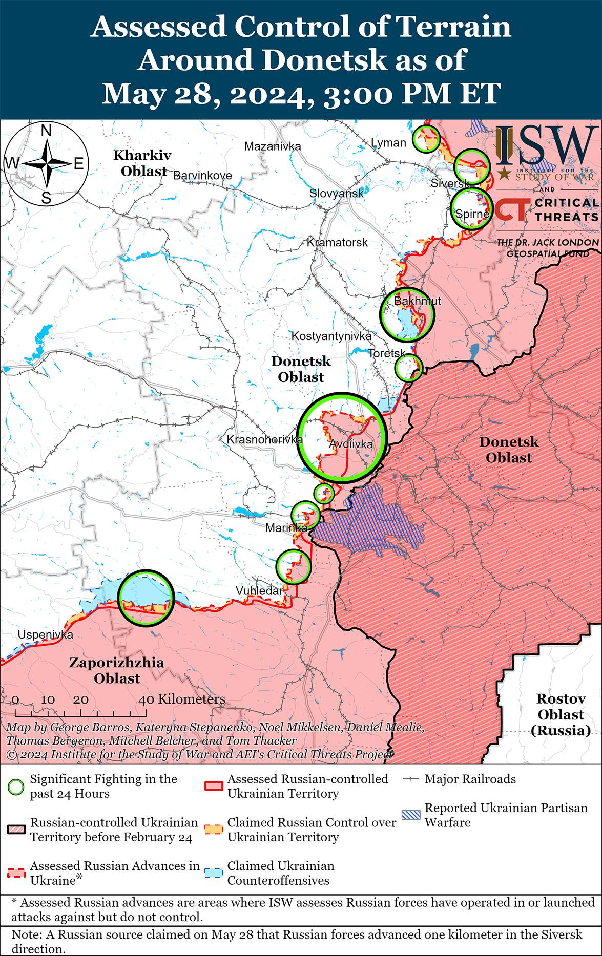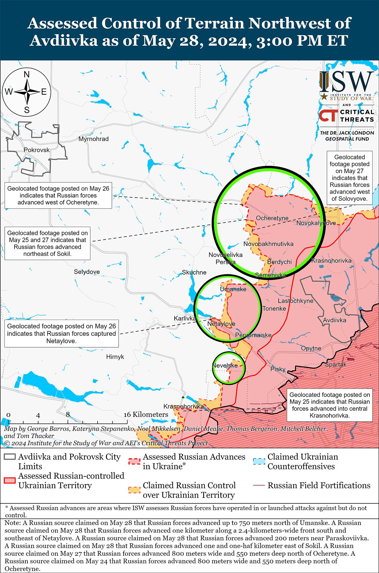 Недавно российские войска незначительно продвинулись во время механизированной атаки численностью до взвода к северо-западу от Авдеевки. На геолоцированных кадрах, опубликованных 28 мая, видно, что российские войска незначительно продвинулись на полях к востоку от Новопокровского (северо-запад Авдеевки) во время механизированной атаки в составе примерно до взвода, прежде чем украинские силы отразили атаку. [78] Российские военные также утверждали, что российские войска продвинулись на 750 метров севернее Уманского (к западу от Авдеевки), на 2,4 км по фронту и один километр в глубину к югу и юго-востоку от Нетайлово (к югу от Уманского и юго-западу от Авдеевки) и подошли с этого фланга к Карловскому водохранилищу (к западу от Уманского) и Карловке (к западу от Нетайлово). [79] Некоторые российские военные блогеры утверждали, что российские войска начали бои за саму Карловку, другие утверждали, что из-за информационного тумана войны говорить об этом слишком рано. [80] ISW пока не обнаружил визуальных доказательств продвижения российских войск в районе Уманского или Нетайлово. Враг также продолжил наземные штурмовые действия к северо-западу от Авдеевки в районах населенных пунктов Новоалександровка, Прогрес, Новоселовка Перша, Калиново, Очеретино и Сокол; западнее Авдеевки в районе Яснобродовки; и юго-западнее Авдеевки в районе Невельского. [81]