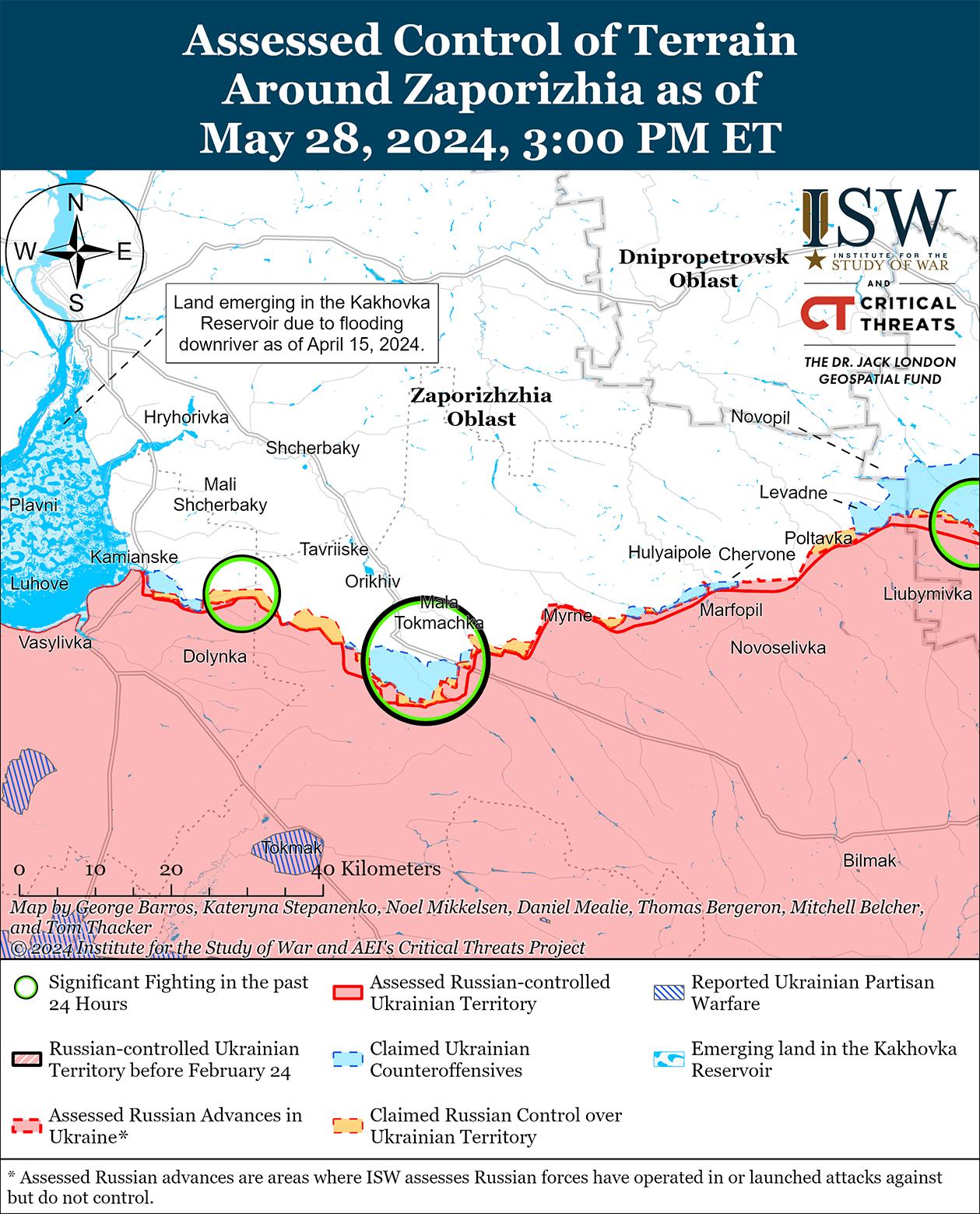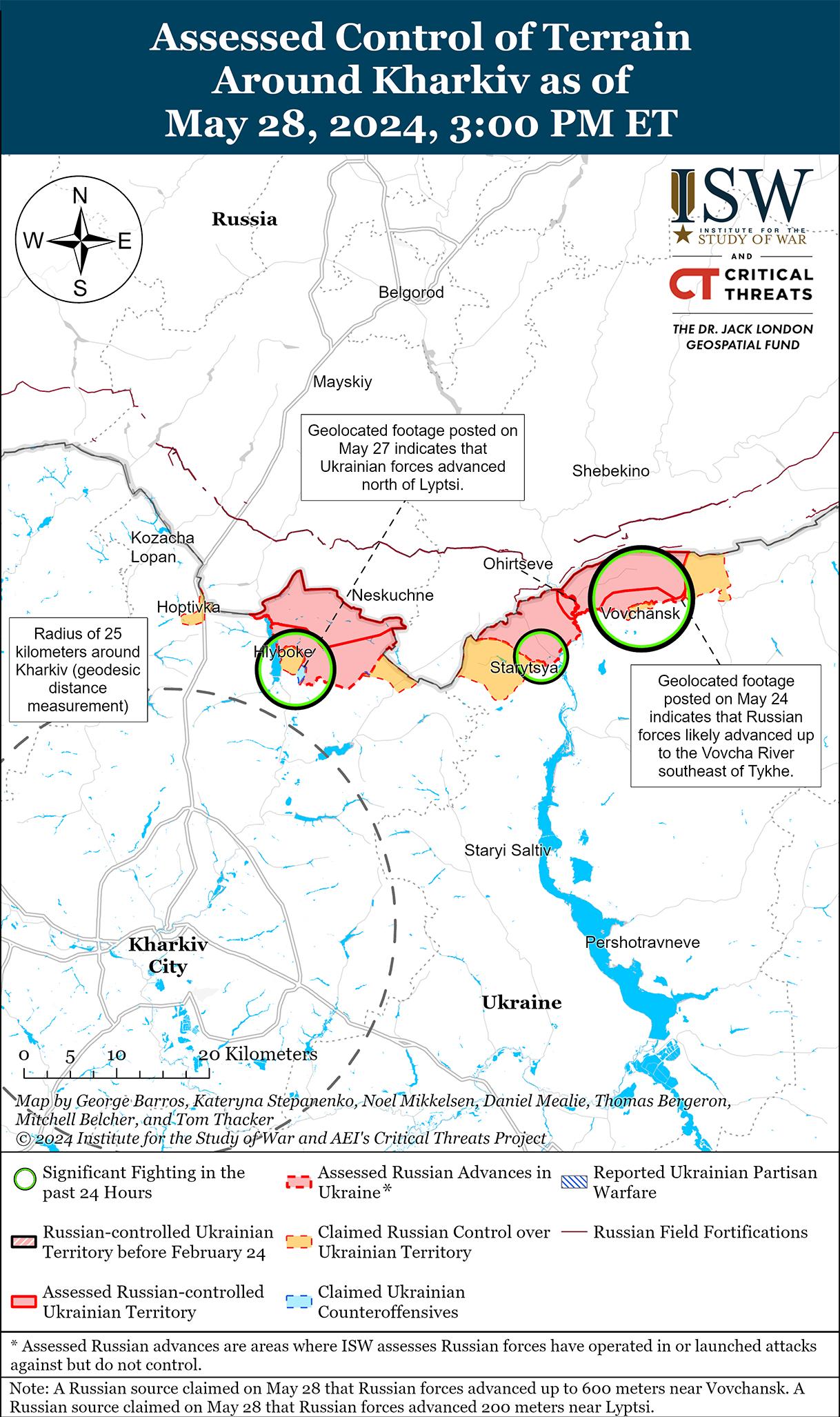 Украинские силы недавно восстановили ограниченные позиции к северу от Харькова на фоне продолжающихся российских наступательных операций на севере Харьковской области 28 мая. На геолоцированных кадрах, опубликованных 28 мая, видно, что украинские силы отбили позиции вдоль ветрозащитной полосы к юго-востоку от Лукьянцев (северо-восточнее Липцы и к северу от Харькова). [57] Российские и украинские военные также сообщали о продолжении наступательных действий на Липцынском и Волчанском направлениях в течение дня 28 мая, а один российский военный блогер утверждал, что российские войска продвинулись на Липцынском направлении до 200 метров. [58] Другой российский блогер утверждал, что российские войска вытесняют украинские войска с позиций в высотных зданиях возле стадиона и Волчанского агрегатного завода на севере Волчанска, хотя ISW пока не наблюдал визуальных подтверждений присутствия российских войск в этих двух районах. [59] Другой российский блогер утверждал, что российские войска продвинулись до 600 метров в неустановленных районах вблизи Волчанска. [60] Украинский Генштаб сообщал о продолжении боев к юго-западу от Волчанска в районе Старица и к северо-востоку от Волчанска в районе Тихое. [61] Официальный представитель украинской Хортицкой группировки войск подполковник Назар Волошин отметил, что российские войска наносят массированные удары по Волчанску из термобарических артиллерийских систем ТОС-2, а российские и украинские источники также отметили, что российские войска постоянно наносят удары планирующими бомбами по инфраструктуре в Волчанске. [62] Сообщается, что на Харьковском направлении продолжают действовать подразделения 44-го армейского корпуса (Ленинградский военный округ) и 6-й общевойсковой армии (Московский военный округ). [63]
