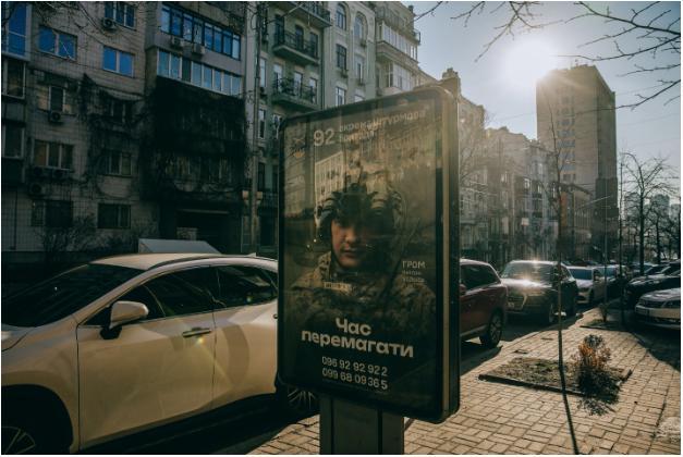 Мобилизационное объявление с надписью «Пора побеждать», призывная кампания 92-й бригады в Киеве.Фотограф: Юлия Кочетова/Bloomberg