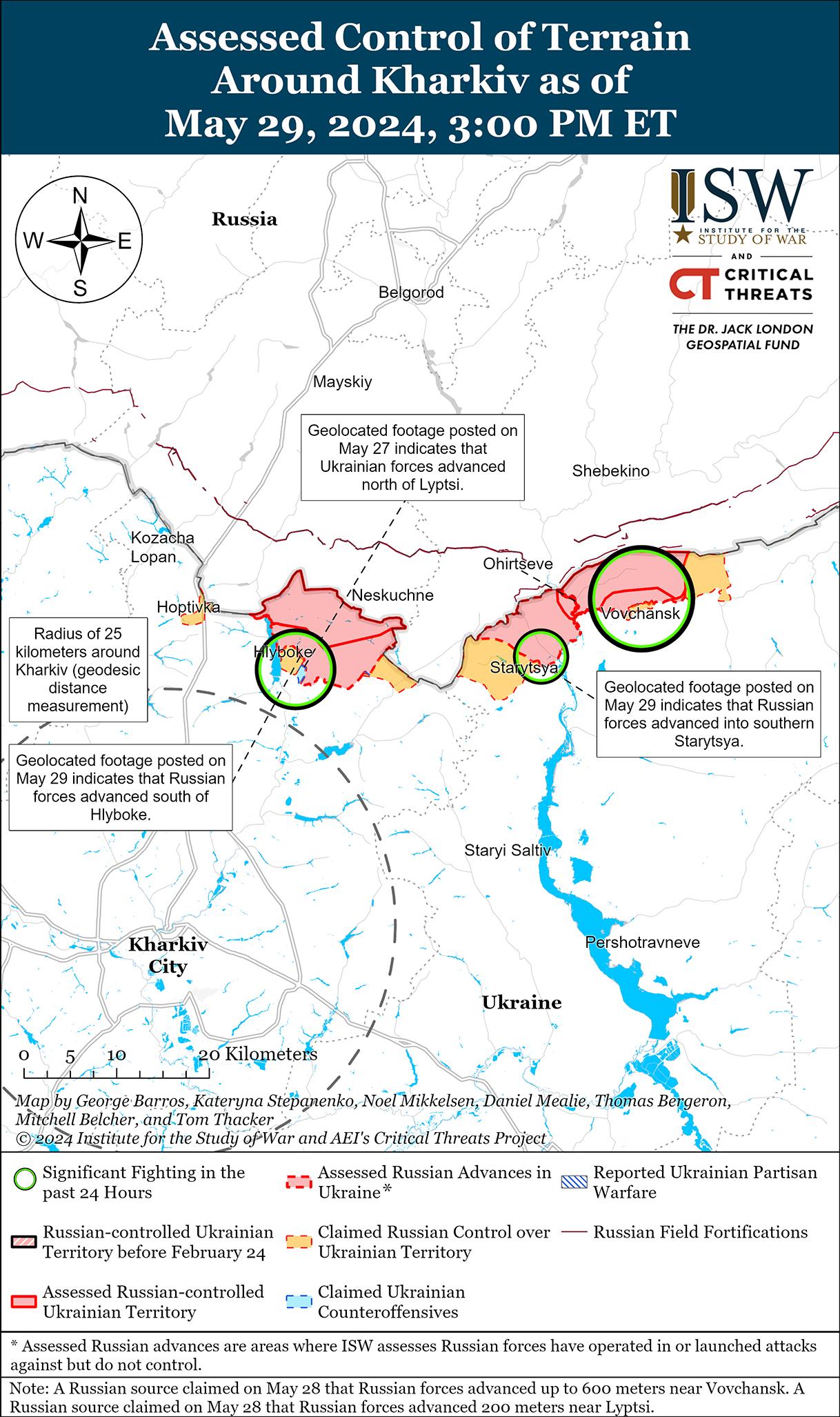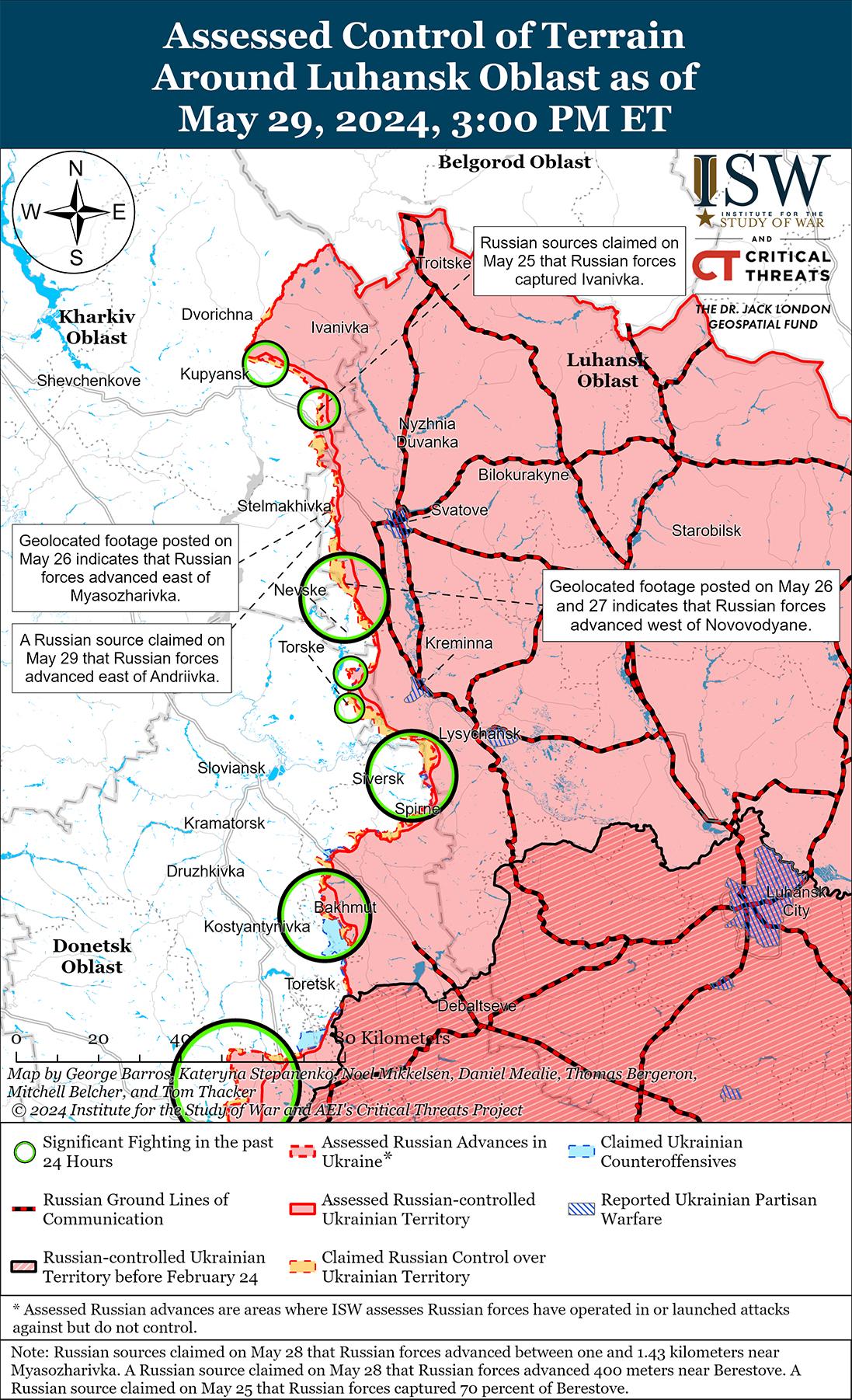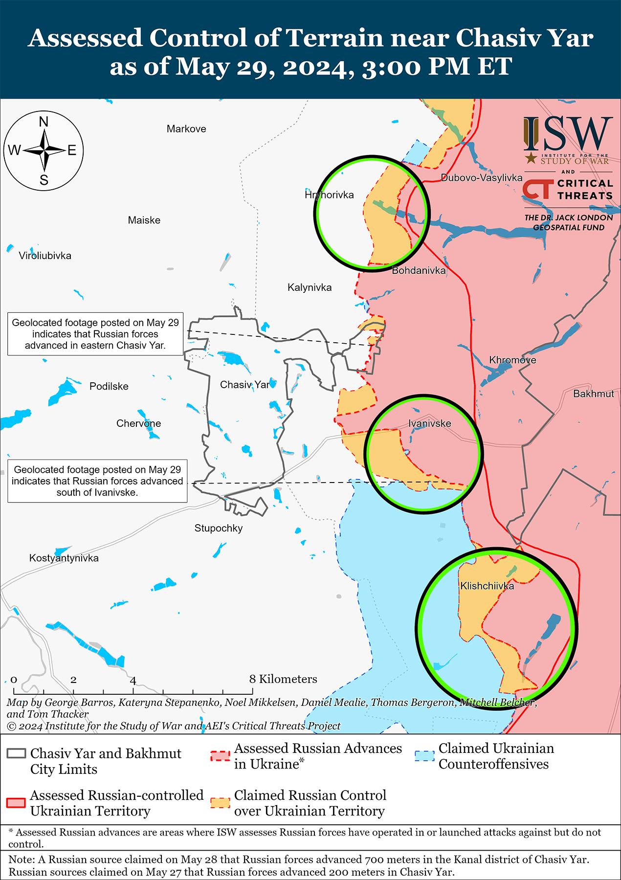 Российские войска недавно добились незначительных успехов к востоку и юго-востоку от Часового Яра. На геолоцированных кадрах, опубликованных 29 мая, видно, что российские войска продвинулись к югу от Ивановского (юго-восточнее Часового Яра) и в пределах микрорайона Канала в восточной части Часового Яра. [49] Военные блогеры сообщали, что российские войска улучшили свои тактические позиции в микрорайоне Канал, что согласуется с имеющимися геолокационными кадрами. [50] Российский военный блогер утверждал, что подразделения российской 98-й воздушно-десантной дивизии (ВДВ) создали новые плацдармы на южной и восточной окраинах микрорайона Новый (также в восточной части Часового Яра), хотя ISW пока не обнаружил визуальных подтверждений присутствия российских войск на окраинах микрорайона Новый или вблизи него. [51] Другой блогер утверждал, что подразделения российской 200-й мотострелковой бригады (14-й армейский корпус, Ленинградский военный округ) вытесняют украинские войска с позиций в лесных массивах к северу от Калиновки (к северу от Часового Яра). [52] Украинский Генштаб сообщил о наземных атаках россиян в районе микрорайона Новый; к северу от Часового Яра в районе Григорьевки; вблизи Ивановского; и юго-восточнее Часового Яра в районе Клещеевки и Андреевки. [53] Сообщается, что в районе Часового Яра продолжают действовать подразделения российской бригады «Север-В» (Российский добровольческий корпус) и батальона БАРС-13 (российский боевой армейский резерв), а также подразделения 98-й дивизии ВДВ и 200-й мотострелковой бригады. [54]