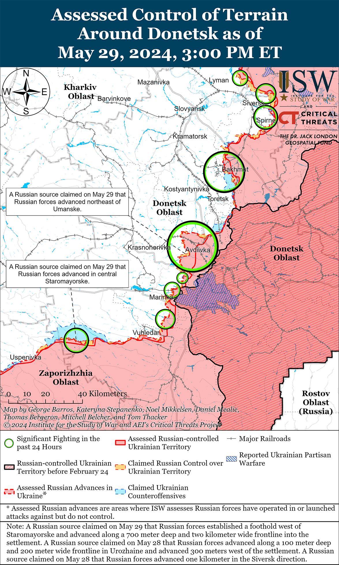 Сообщается, что недавно российские войска продвинулись в районе границы Донецкой и Запорожской областей. 29 мая несколько российских военных блогеров заявили, что подразделения российского 394-го мотострелкового полка и 218-го танкового полка (оба входят в состав 127-й мотострелковой дивизии 5-й ОА Восточного военного округа) продвинулись в центральную часть Старомайорского и Урожайное (оба южнее Великой Новоселки). [64] Один из блогеров утверждал, что российские войска продвинулись на 100 метров вглубь на фронте 200 метров на север в Урожайное и на 100 метров на фронте 300 метров в районе Старомайорского. [65] ISW пока не обнаружил визуальных подтверждений этих заявленных успехов, но обнаружил кадры недавних российских танковых атак сокращенной роты в районе Старомайорского. [66] Российские войска, возможно, добились незначительных успехов во время этих атак.