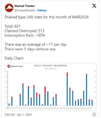 Количество «Шахедов» вызывает гораздо меньше беспокойства, чем скорость, с которой они развиваются. В марте было сбито 85% прибывающих Shahed, согласно заявлениям украинских военных, составленным OSINT-аналитиком ShahedTracker. Это притупляет эффект от кампании Шахедов, но если большее количество беспилотников прорвется, ущерб увеличится.