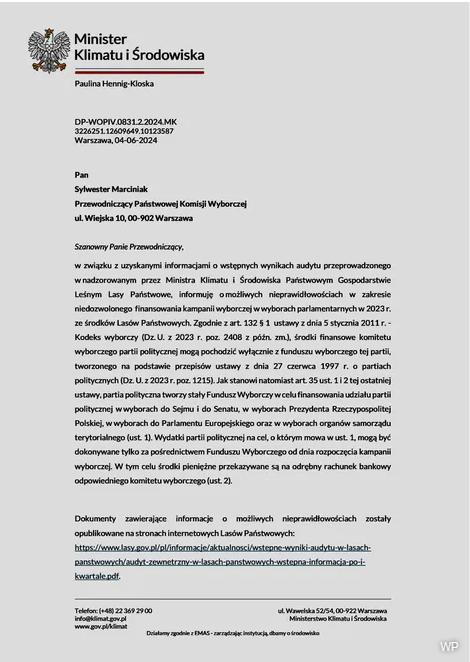 “В связи с полученной информацией о предварительных результатах проверки, проведенной в Государственном лесном холдинге, курируемом министром климата и окружающей среды, хотел бы сообщить Вам о возможных нарушениях в объеме несанкционированного финансирования избирательной кампании. на парламентских выборах 2023 года из средств государственных лесов”, – написала Паулина Хенниг-Клоска, министр климата и окружающей среды, в письме председателю Национальной избирательной комиссии Сильвестру Марчиняку..