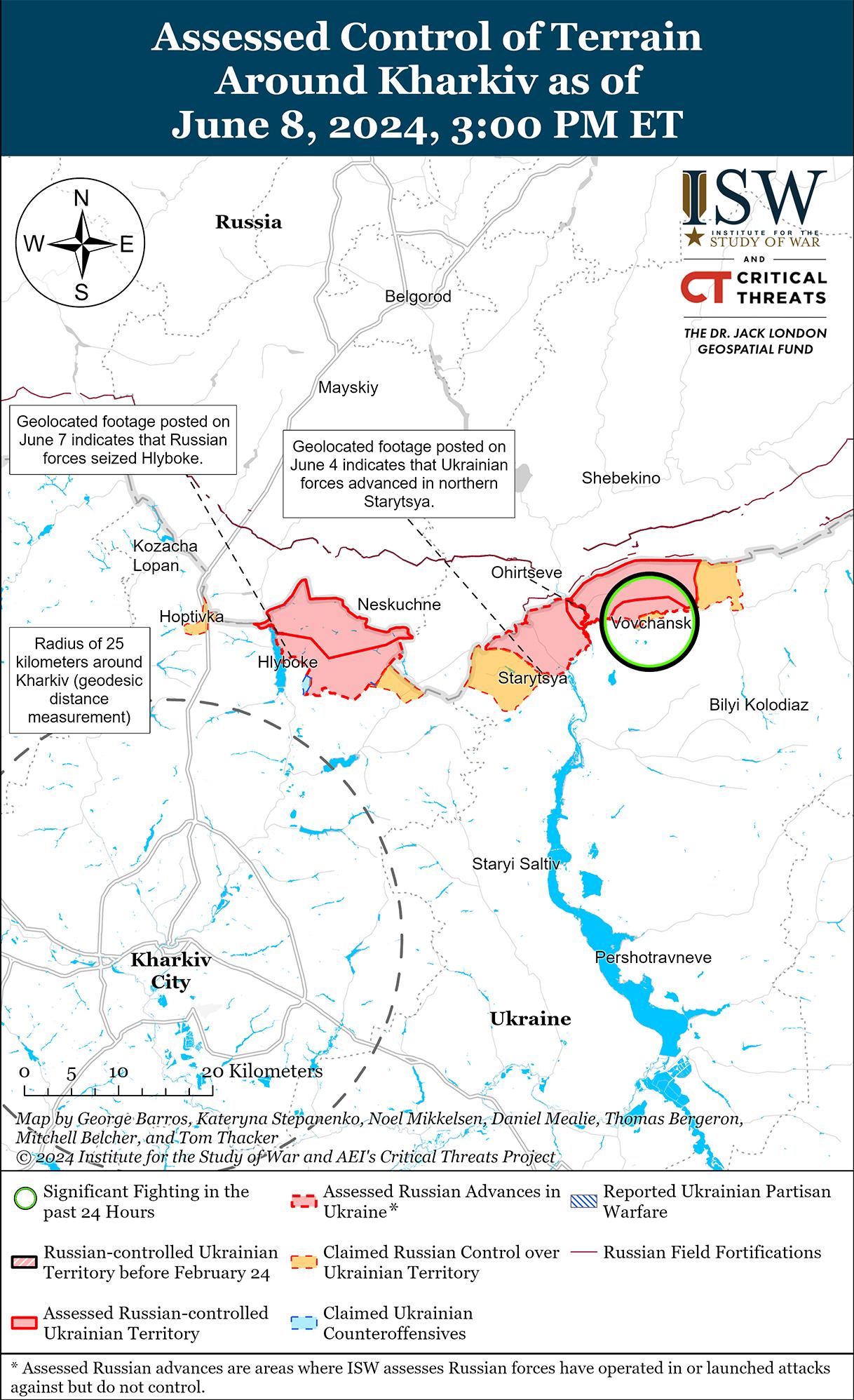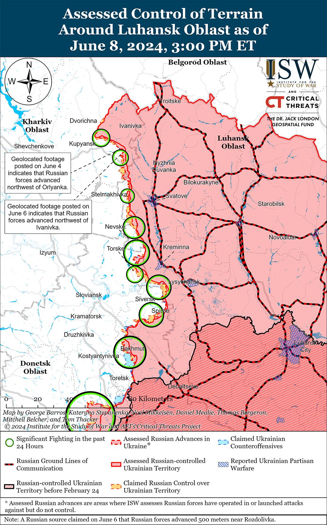 Сообщается, что 7 и 8 июня украинские силы проводили тактические контратаки к северо-востоку от Харькова в Волчанске, в то время как российские войска продолжали наступательные действия вблизи Волчанска, однако подтвержденных изменений линии фронта на этом участке не было. [45] 8 июня пресс-секретарь украинской Хортицкой группировки войск подполковник Назар Волошин заявил, что с 1 мая 2024 г. российские войска выпустили по Волчанску более 300 управляемых планирующих бомб. [46] Волошин также заявил 8 июня, что украинские силы сохраняют контроль над большей частью Волчанска, подразумевая, что украинские силы недавно проводили тактические контратаки в Волчанске. [47] Немецкое издание BILD сообщило 8 июня, что украинские силы контратаковали в районе Волчанска и освободили несколько кварталов города. [48] В настоящее время ISW не может проверить сообщения об успешных украинских контратаках в районе Волчанска. Официальный представитель Совета национальной безопасности США Джон Кирби заявил 7 июня, что украинская первая линия обороны остановила продвижение россиян на Харьковском направлении и что российские войска отвели часть подразделений, действующих на Харьковском направлении, от линии фронта. [49]