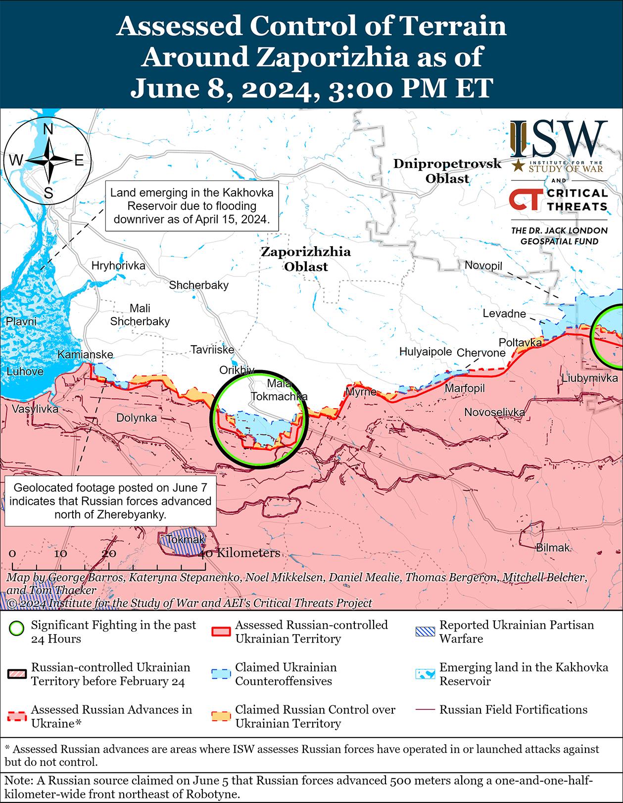 8 июня российские источники заявили, что российские войска продвинулись в районе Работино, но ISW не обнаружил визуальных доказательств, подтверждающих эти заявления. Председатель комиссии по вопросам суверенитета при администрации президента РФ и сопредседатель Совета по интеграции российских оккупационных войск Владимир Рогов (который часто делает сомнительные сообщения о линии фронта в Запорожской области) заявил, что российские войска продвинулись к северу от Работино и что ближайшие позиции украинских войск находятся примерно в 500-700 метрах к северу от северной окраины Работино. [76] Российский военный блогер утверждал, что российские войска незначительно продвинулись в районе Малой Токмачки (северо-восточнее Работино). [77] Сообщалось о наступлении российских войск в районе Работино; к востоку от Работино близ Вербовое; северо-восточнее Работино в районе Малой Токмачки и Новопокровки; и южнее Работино в районе Новопрокоповки 7 и 8 июня. [78] Российские войска также вели наступление к западу и северо-западу от Работино в районе Копани и к югу от Малых Щербаков соответственно. [79] Сообщается, что подразделения 1430-го мотострелкового полка Российской гвардии (58-я общевойсковая армия [ОА], Южный военный округ [ЮВО]) действуют в районе Работино. [80]