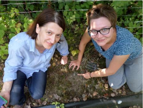 Фото. Кандидат технических наук. Дорота Хильщаньска и доктор инж. Александра Роза-Грушекка указывает на первое плодовое тело трюфеля летнего (Tuber aestivum Vittad.), найденное в трюфельном саду (фото С. Глина)