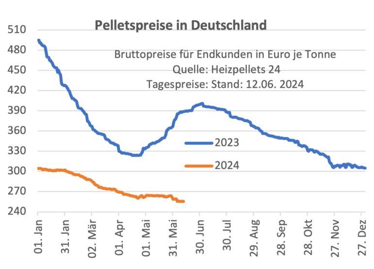 В среднем по Германии покупатели пеллет на этой неделе по-прежнему платят менее 260 евро за тонну, что на 5 евро меньше, чем в конце мая, и примерно на 15 евро меньше, чем в начале апреля. По сравнению с началом года пеллеты сейчас стоят на €45 меньше, а по сравнению с ценой на конец июня 2023 года (€400) покупателям пеллет в этом году придется заплатить на €142 меньше за тонну.