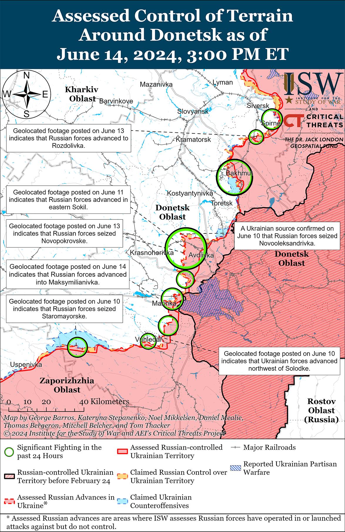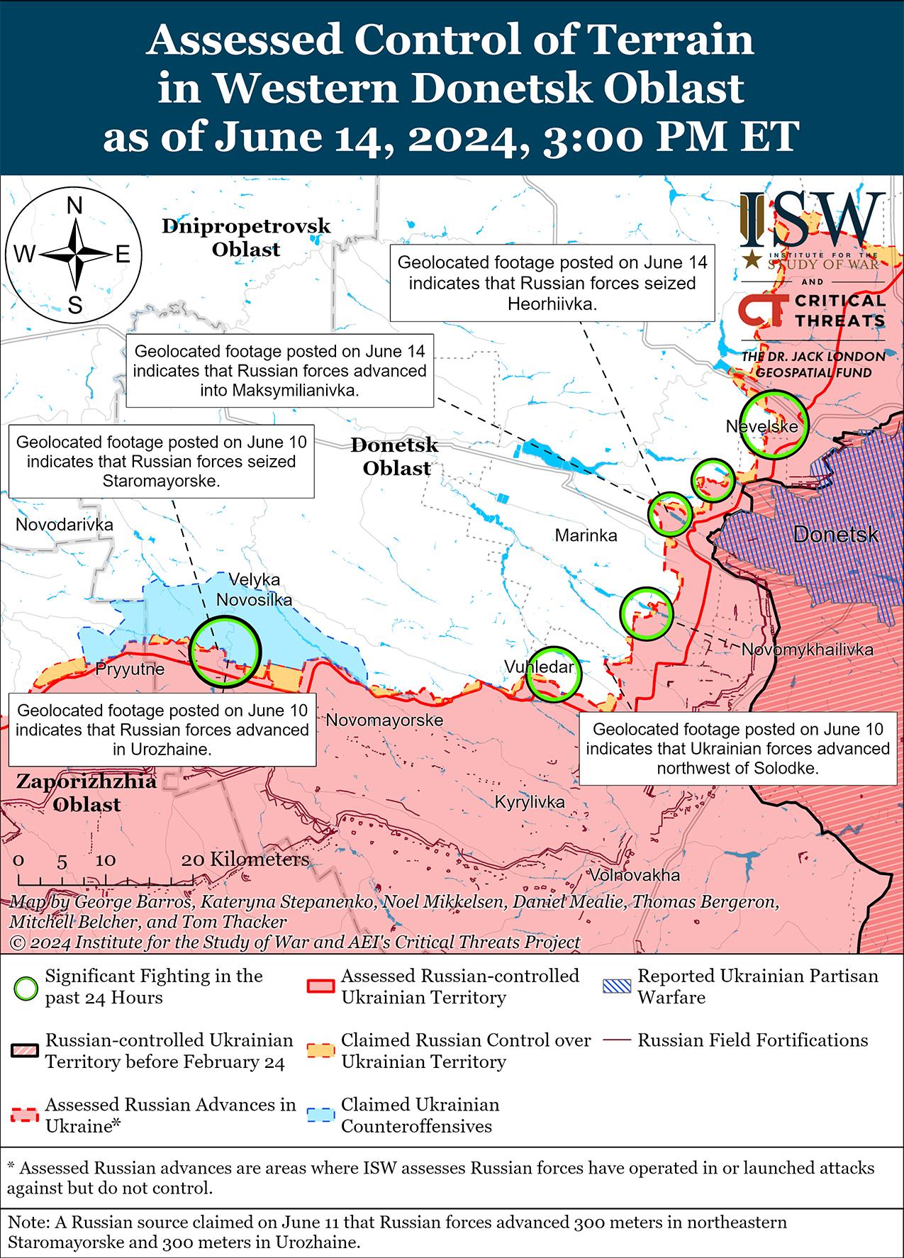 Российские войска недавно захватили Георгиевку (к западу от Донецка) в ходе механизированного штурма численностью до батальона к западу от Донецка на фоне продолжающихся обстрелов к западу и юго-западу от города. Геолоцированные кадры, опубликованные 14 июня, свидетельствуют о том, что российские войска недавно захватили Георгиевку и продвинулись в восточной части Максимильяновки (к западу от Донецка) в ходе механизированного штурма численностью до батальона. [66] Украинские военные источники сообщали, что в ходе атаки российские войска использовали 28 единиц бронетехники и уничтожили 13 единиц российской бронетехники. [67] На кадрах, опубликованных 14 июня, видно, что российские войска в последнее время незначительно продвинулись в центральной части Красногоровки (к западу от Донецка). [68] Дополнительные геолоцированные кадры, опубликованные 14 июня, свидетельствуют о том, что российские войска недавно незначительно продвинулись к северо-западу от Солодки (юго-запад Донецка). [69] Российские военные блогеры широко утверждали, что подразделения российских 5-й и 110-й мотострелковых бригад (обе ДНР) продвигаются в пределах Красногоровки, а другие неназванные российские подразделения продвигаются в пределах Георгиевки (западнее Марьинки и Донецка) и на окраинах Максимильяновки (западнее Донецка). [70] 13 и 14 июня российские войска продолжали атаки к юго-западу от Донецка в районах населенных пунктов Парасковиевка, Константиновка и Водяное. [71]