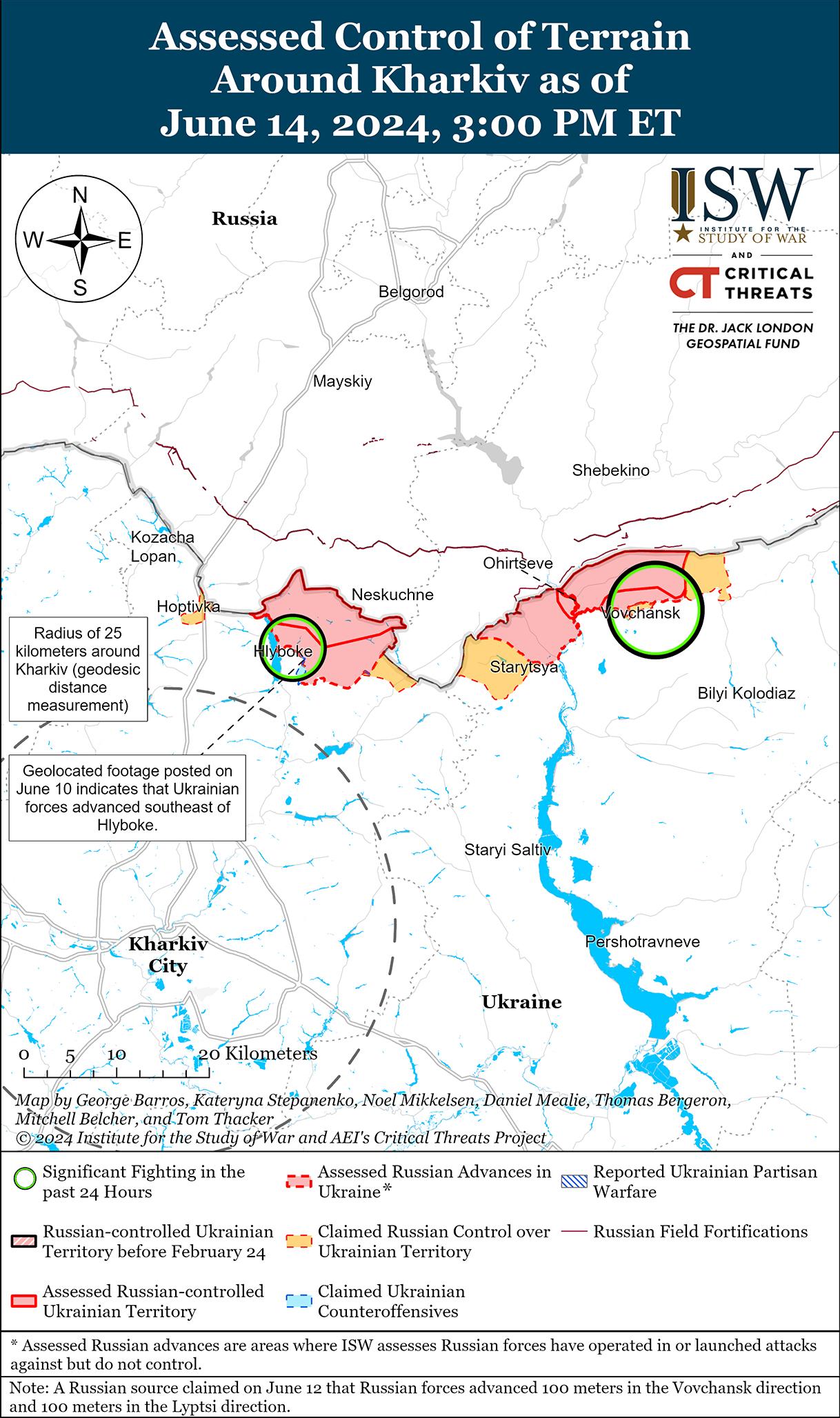 14 июня российские войска продолжили наступательные действия на севере Харьковской области, однако подтвержденных изменений на линии фронта в этом районе не было. Российские источники утверждали, что российские войска продвинулись до 100 метров в неустановленной части Волчанска, хотя ISW не видел визуального подтверждения этого заявления. [43] Бои продолжались в районе Липцы; к северу от Липцов у Глубокого; в черте Волчанска, в том числе вблизи агрегатного завода; и восточнее Волчанска в районе Тихое 13 и 14 июня. [44] Президент России Владимир Путин вновь заявил, что российские наступательные операции на севере Харькова являются частью усилий по созданию «буферной зоны» для защиты российских приграничных районов от украинских ударов, признав, что российские войска не отодвинули украинские войска достаточно далеко от международной границы, чтобы предотвратить дальние удары по российской территории. [45] Пресс-секретарь украинской группировки войск «Хортица» подполковник Назар Волошин заявил 14 июня, что с 10 мая по 10 июня российские войска потеряли около 4 000 человек убитыми и ранеными в Харьковской области. [46] Сообщается, что в Волчанске действуют подразделения чеченского спецназа «Аида» имени Ахмата. [47]